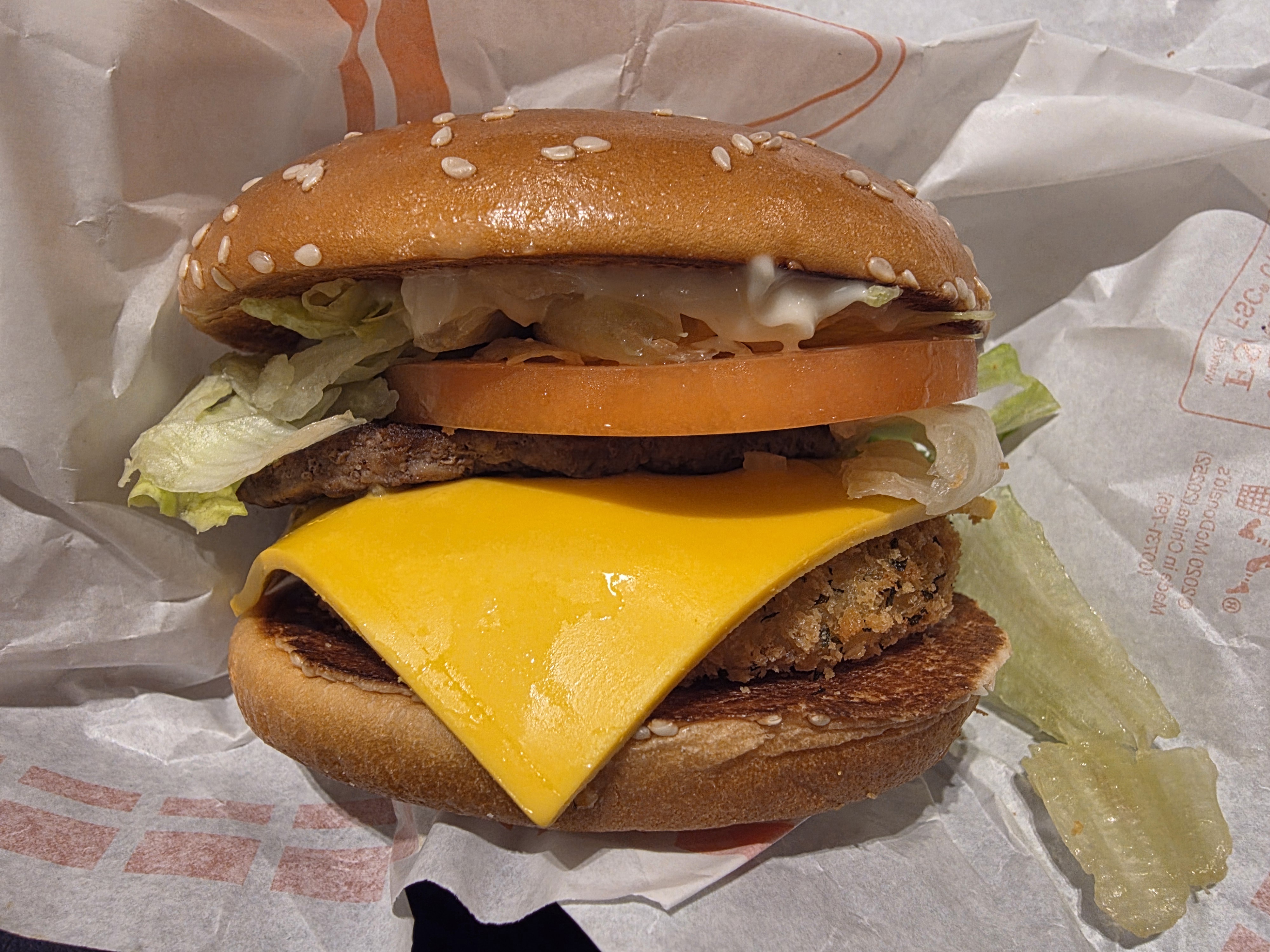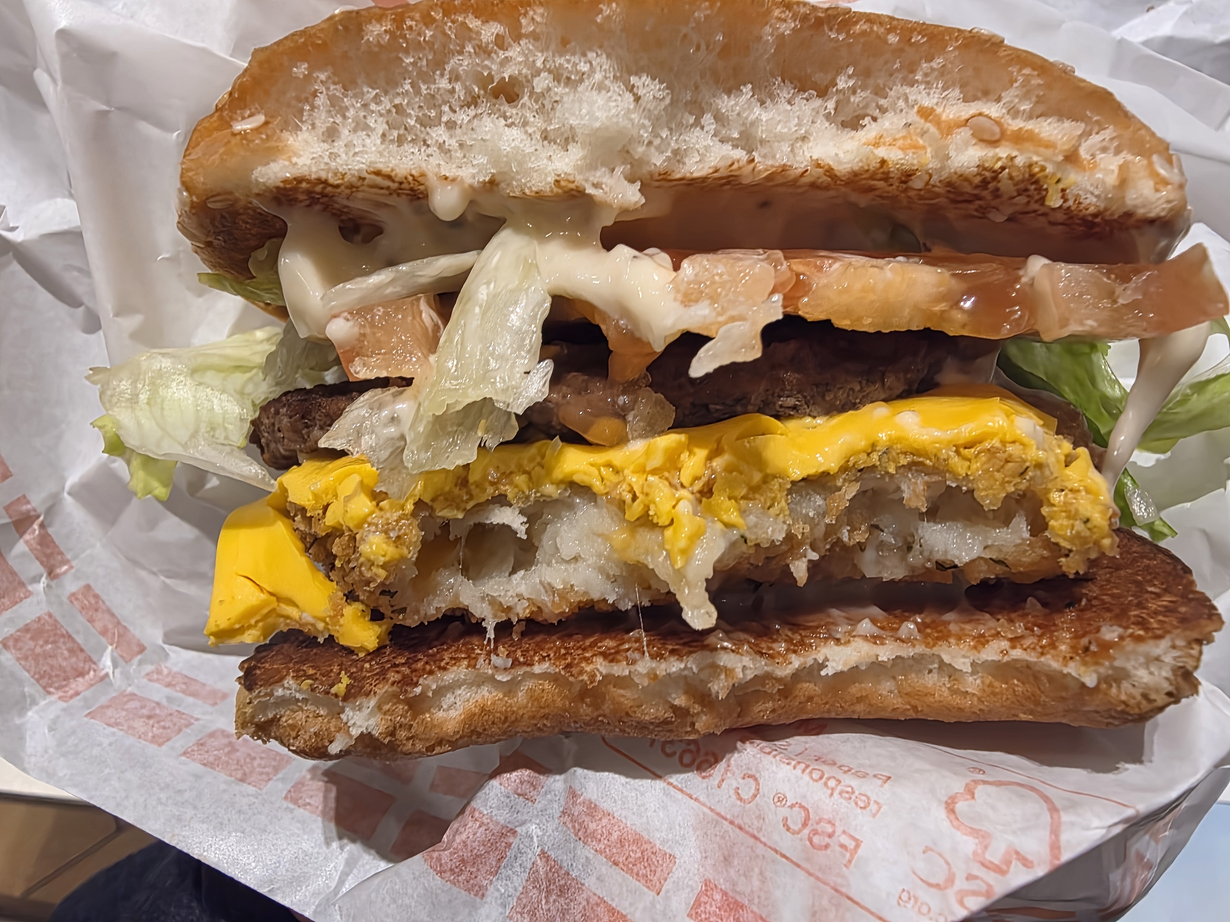 다만 맨 밑에 깔린 알리고 크로켓이 이 버거가 일반적인 맥도날드 버거들과 가장 큰 차별점, 구분점을 두었구나는 것을 느낄 수 있었는데요, 뭔가 해쉬브라운같은 식감이지만 조금 더 바삭한 쪽에 가까운 식감이었고, 그 다음에 안에 들어가 있는 치즈가 감자와 함께 조화를 이루며 다채로운 맛을 선사합니다.
