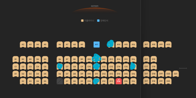 원래는 209석이었으나, 리클라이너 도입으로 인해 93석으로 절반 이상 줄었고 줄 역시 E열까지밖에 없습니다.