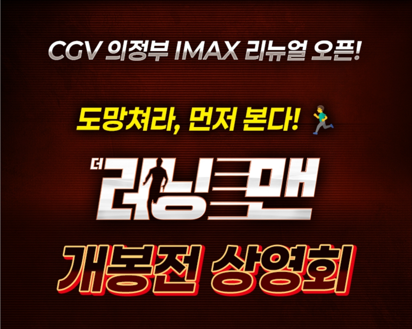 또 이 외에 개봉전에 관람한 관객을 대상으로 더 러닝 맨 아이맥스 포스터 증정 이벤트도 진행한다고 하니, 의정부 아이맥스 근처에 거주하시거나 영화 더 러닝맨을 기대하시는 분께서는 놓치지 말고 참여해 보시는 것도 나쁘지 않으리라 생각합니다.