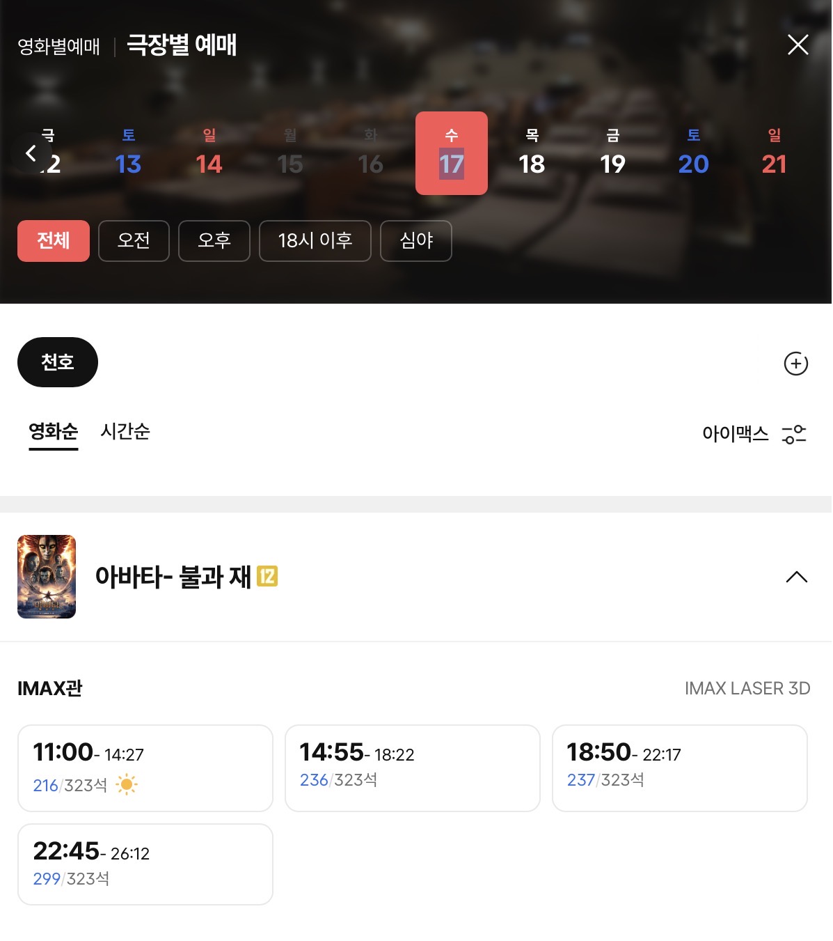 어제 CGV앱 예매창에서 천호CGV의 아이맥스관 예매창이 열렸습니다.