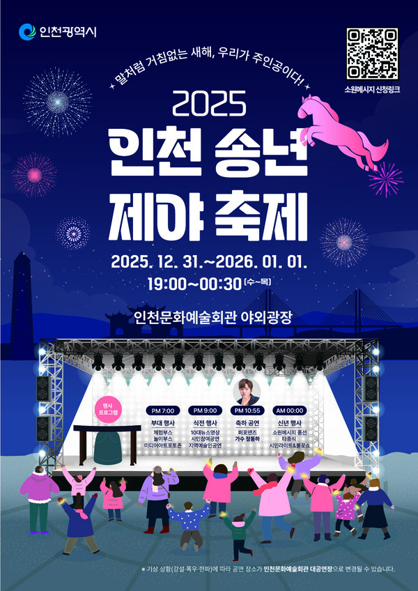 2025년 12월 31일 수요일 저녁부터 1월 1일 목요일 00시 30분까지 송년 행사와 새해맞이 행사가 인천 예술회관 야외광장에서 열릴 예정이라고 합니다.
