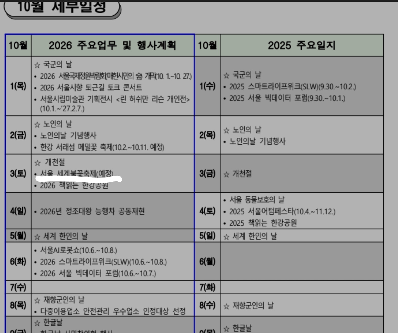 여기서 알 수 있듯이 2026년 올 해 서울세계불꽃축제는 10월 3일 토요일, 즉 개천절에 열릴 예정이라고 합니다.