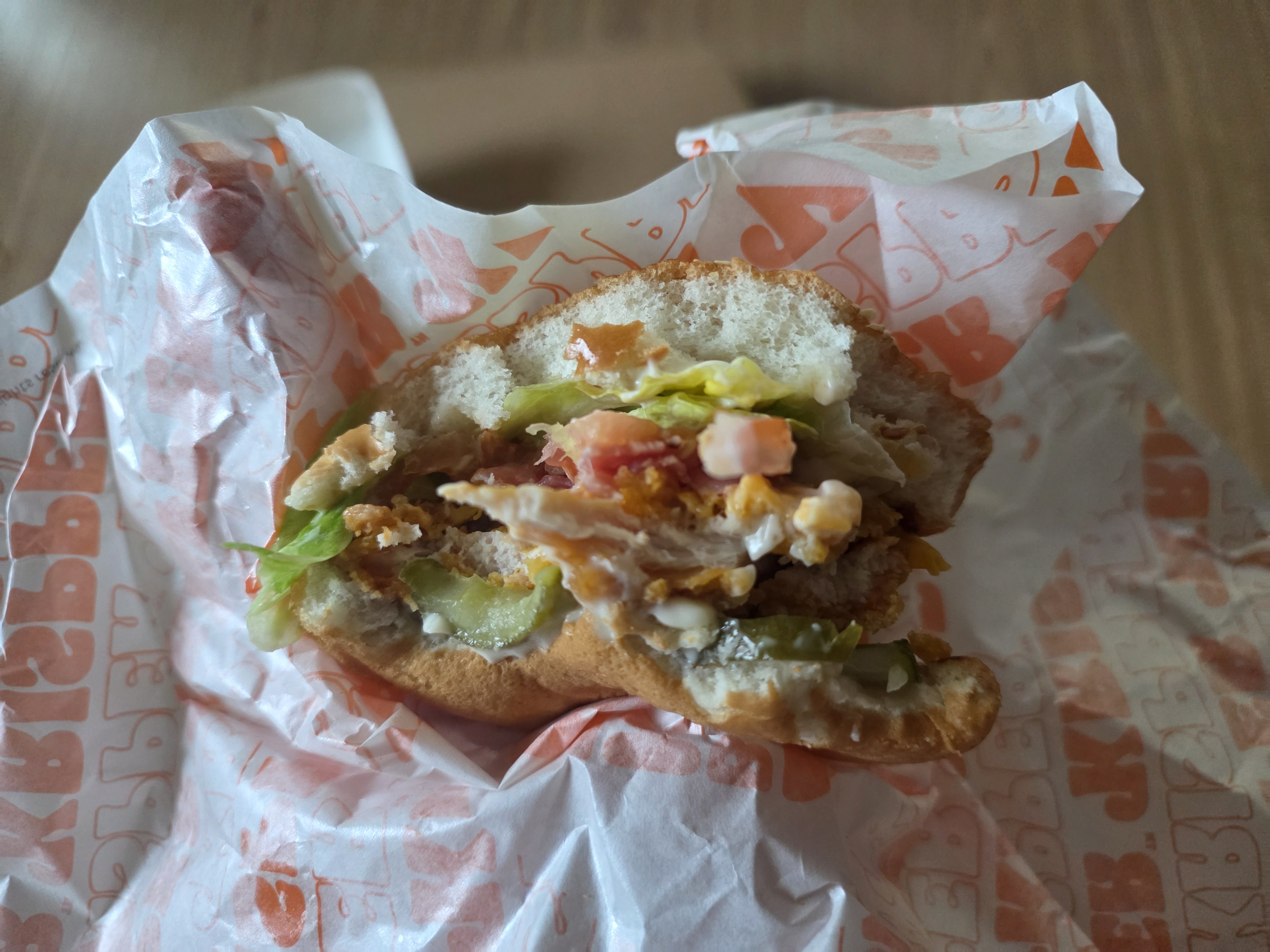 포장을 벗겨내니 이렇게 치킨 패티가 번을 벗어날 정도로 꽤 크게 들어가 있는 모습입니다.
