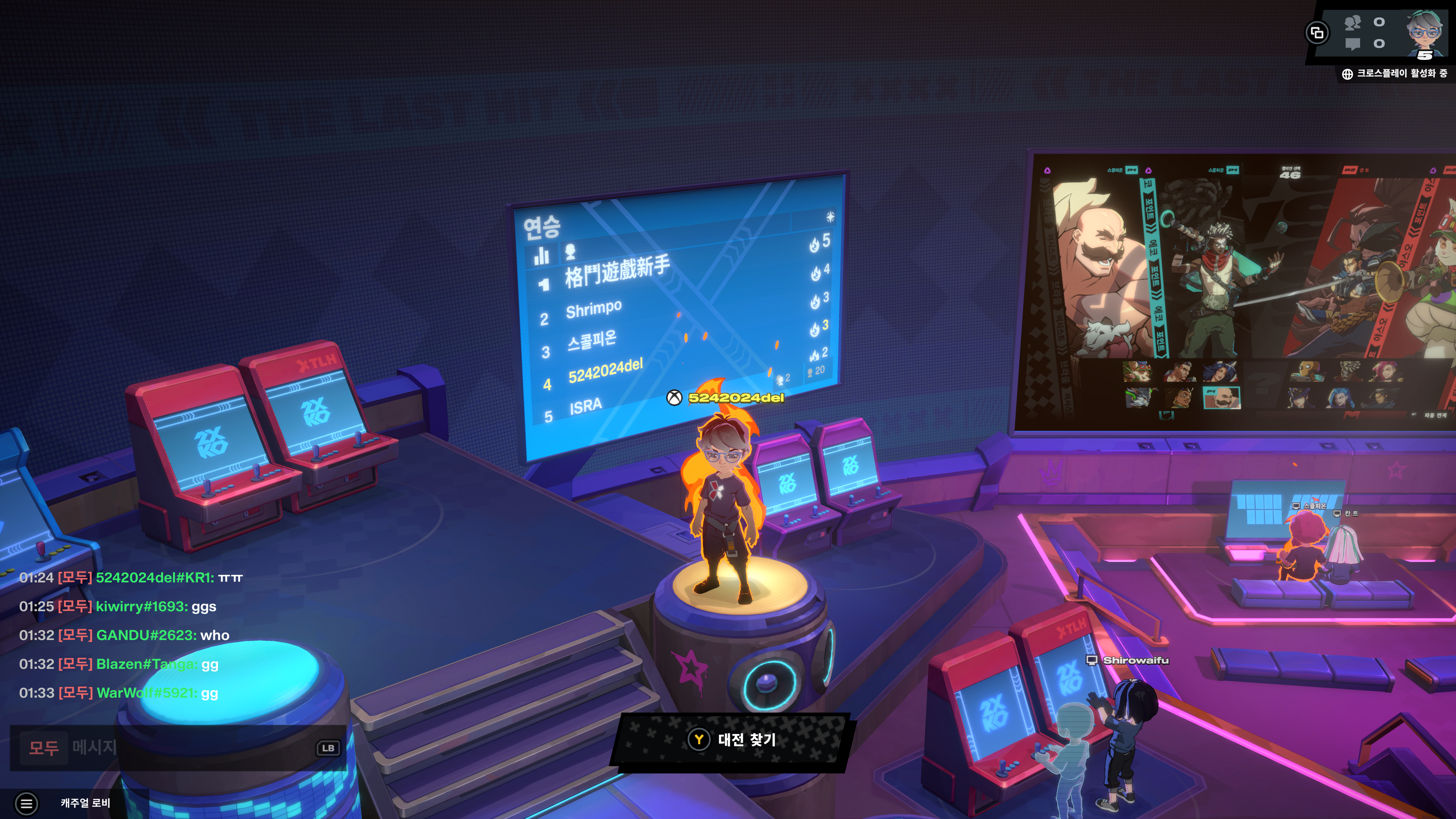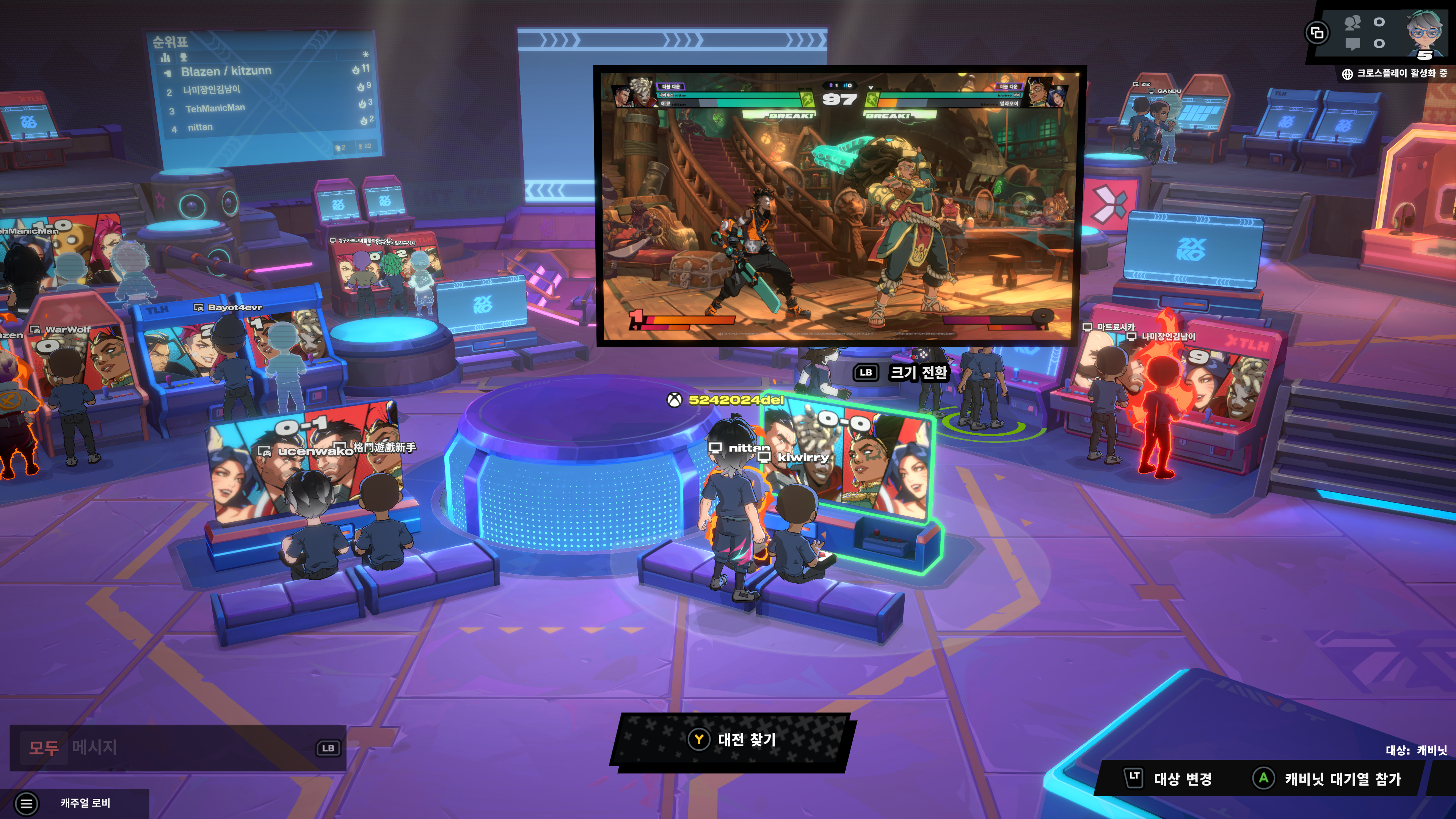 매칭하는 과정이 기존에 했던 격투게임들과 비교하면 상당히 가볍고 케주얼하다는 느낌이었습니다. 오락실 같은 공간에 들어가서 원하는 곳에서 다른 사람들과 매칭을 할 수 있고, 또 다른 사람들의 게임을 쉽게 구경을 할 수도 있습니다. 오락실에서 정말 구경하는 듯한 로비시스템인데 이 점은 상당히 인상적이었습니다. 기본적으로 크로스 플랫폼 설정이 되어 있기 때문에 PC나 플스, 엑박 모두 다 골고루 같은 공간에서 아바타들이 돌아다니는 모습입니다. 또 2명이 한 팀으로 하는지 아니면 1대1로 플레이어가 맞붙는지도 확인 할 수 있습니다.