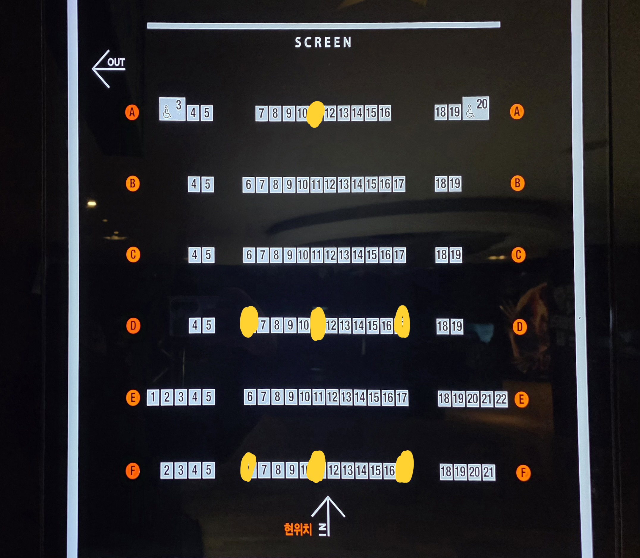 명당을 추천한다면 C,D,E열의 가운데 구역 6~17번 좌석 전체라고 할 수 있겠습니다. 시네마스코프 비율 스크린이 설치되어 상영관의 구조가 좌우로 긴 편이기 때문입니다.