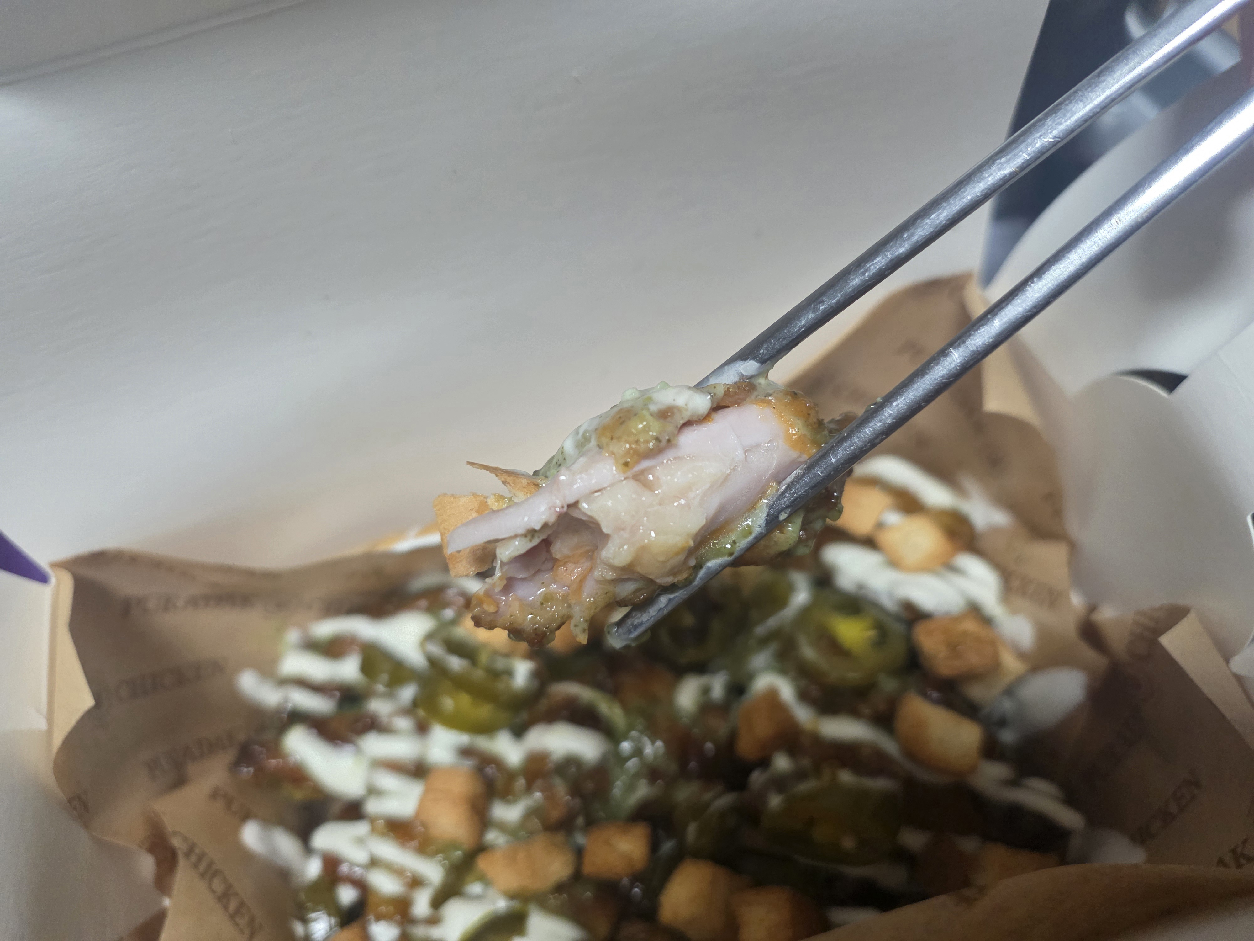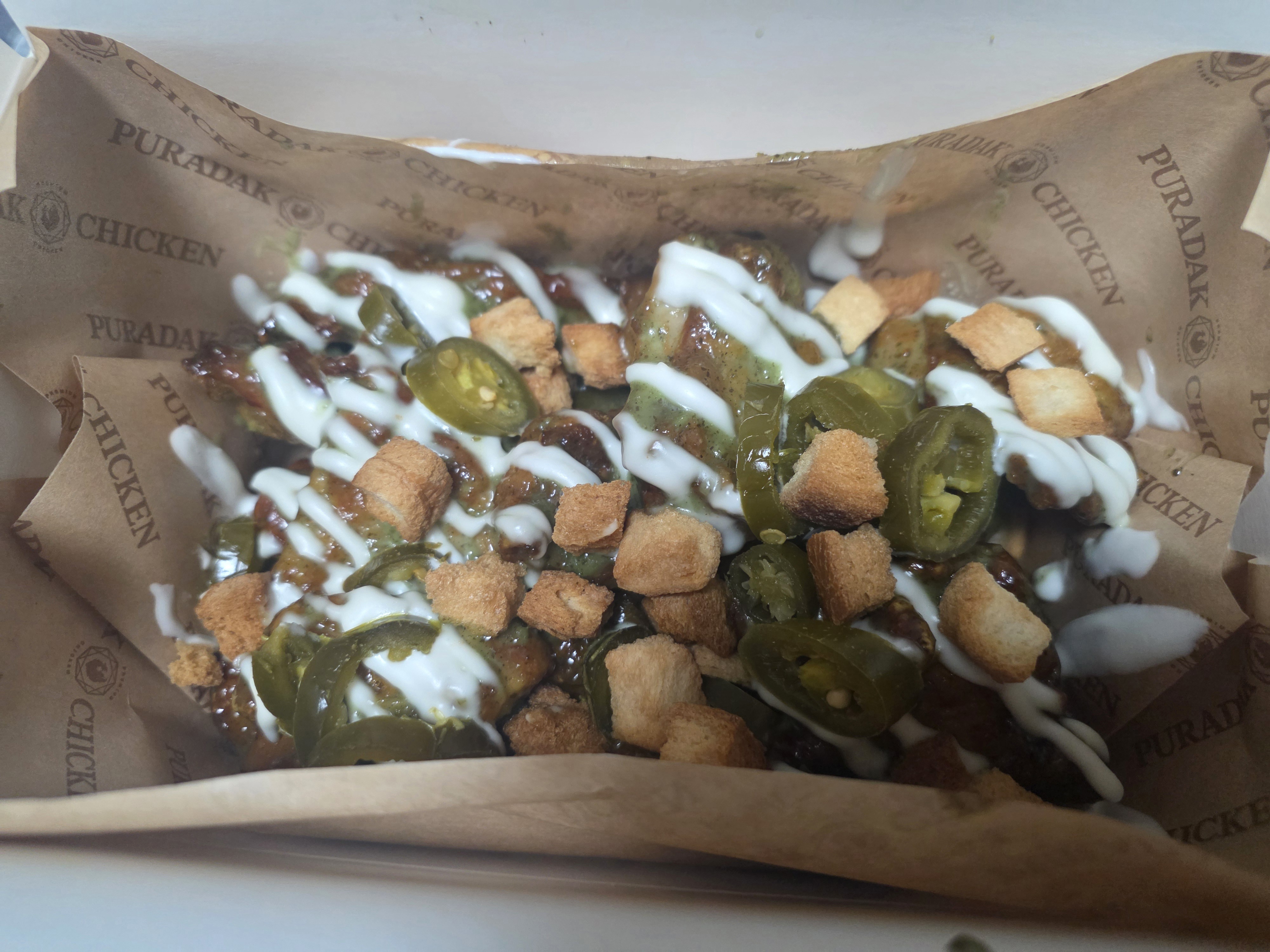 일단 포장을 뜯으면 이렇게 치킨 위에 사워크림과 생크림이 조합된 드리즐이 뿌려져 있고,