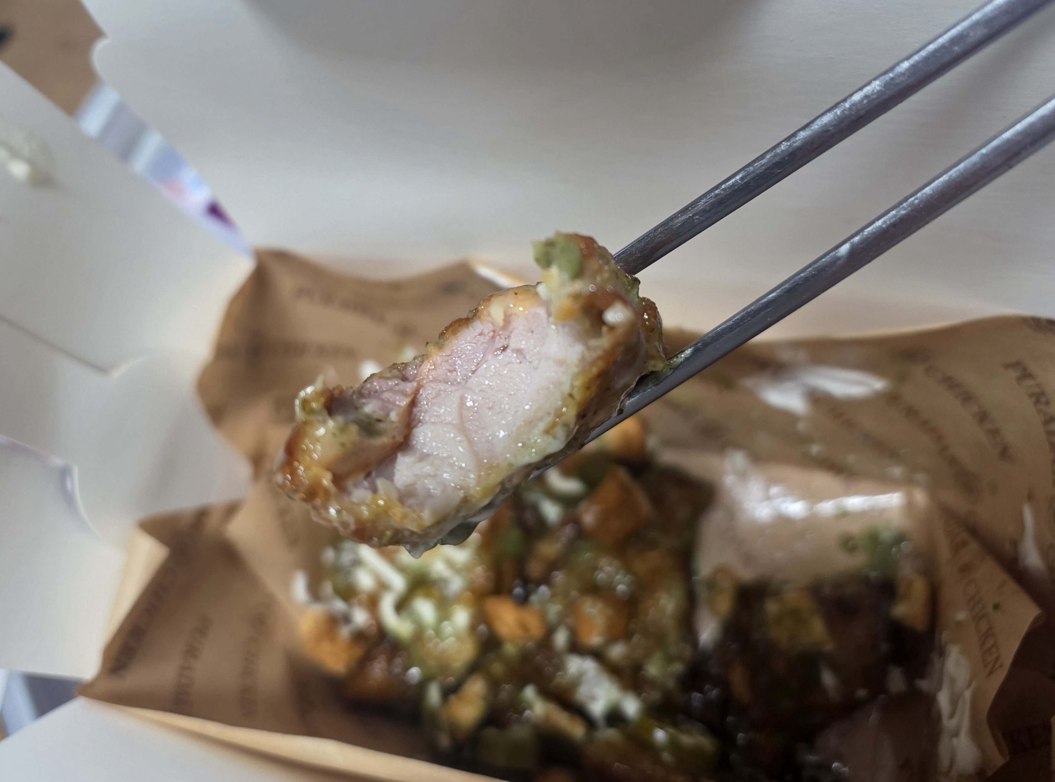 겉은 상당히 얇게 튀겨진 튀김옷이 입혀져 있는데요. 여기에 특제 마요소스가 풍족하게 잘 묻어져 있어 촉촉한 식감이 그대로 전해집니다. 그리고 위의 사진들에서 알 수 있듯 확실히 바삭하게 먹는 치킨류는 아닙니다.