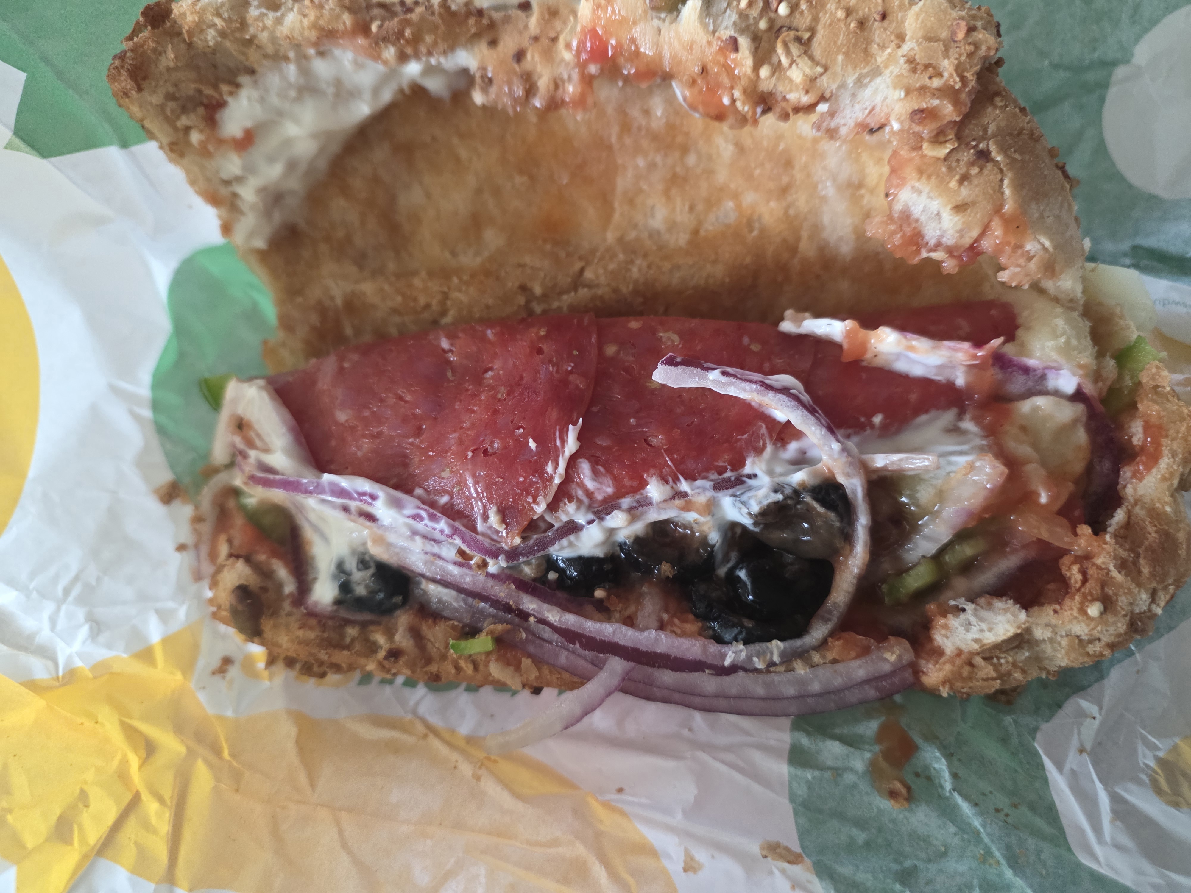 전반적으로 페퍼로니 햄의 맛이 강합니다. 고기가 아예 없이 이 샌드위치의 메뉴에서 고기 부분을 이 페퍼로니 햄이 전부 맡는 역할인데요. 평소에 페퍼로니 피자를 즐기시거나 살짝 짠 느낌의 고기를 자주 드시는 분이라면 별 문제가 없겠지만 햄 특유의 짠맛이 제법 있는 편이라 간이 세다, 짠 것에 거부감이 있다면 살짝 드시기 힘들 수 있겠다는 생각입니다.