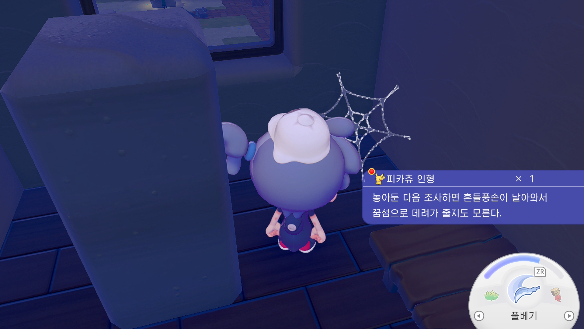 천조각을 얻기 어렵다면 해안마을 입구에서 바로 앞에 있는 집들 안으로 들어가 둘러보게 되면 위의 그림처럼 구석진 벽 모퉁이에 거미줄이 있는 경우가 있습니다. 이 외에도 해안마을 곳곳에 있는 폐허가 된 건물 잔해들 안에서 거미줄을 발견할 수 있는데 역시 마찬가지로 거미줄을 풀베기하면 실뭉치를 얻을 수 있습니다.