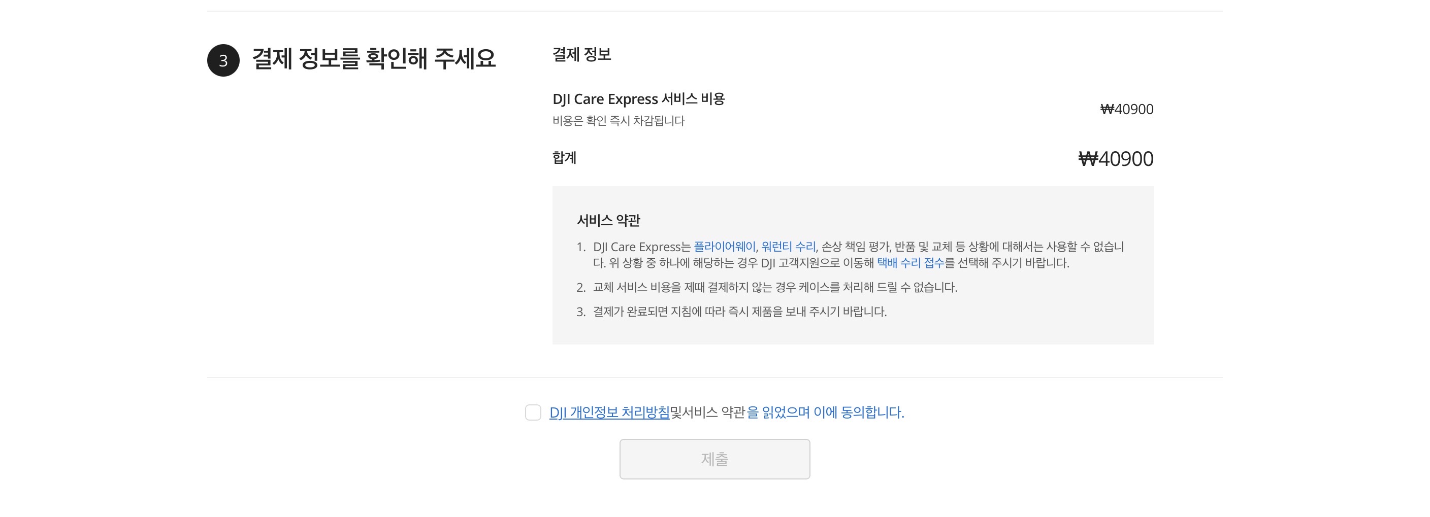 DJI 케어 익스프레스 서비스 비용인 40,900원을 결제합니다.