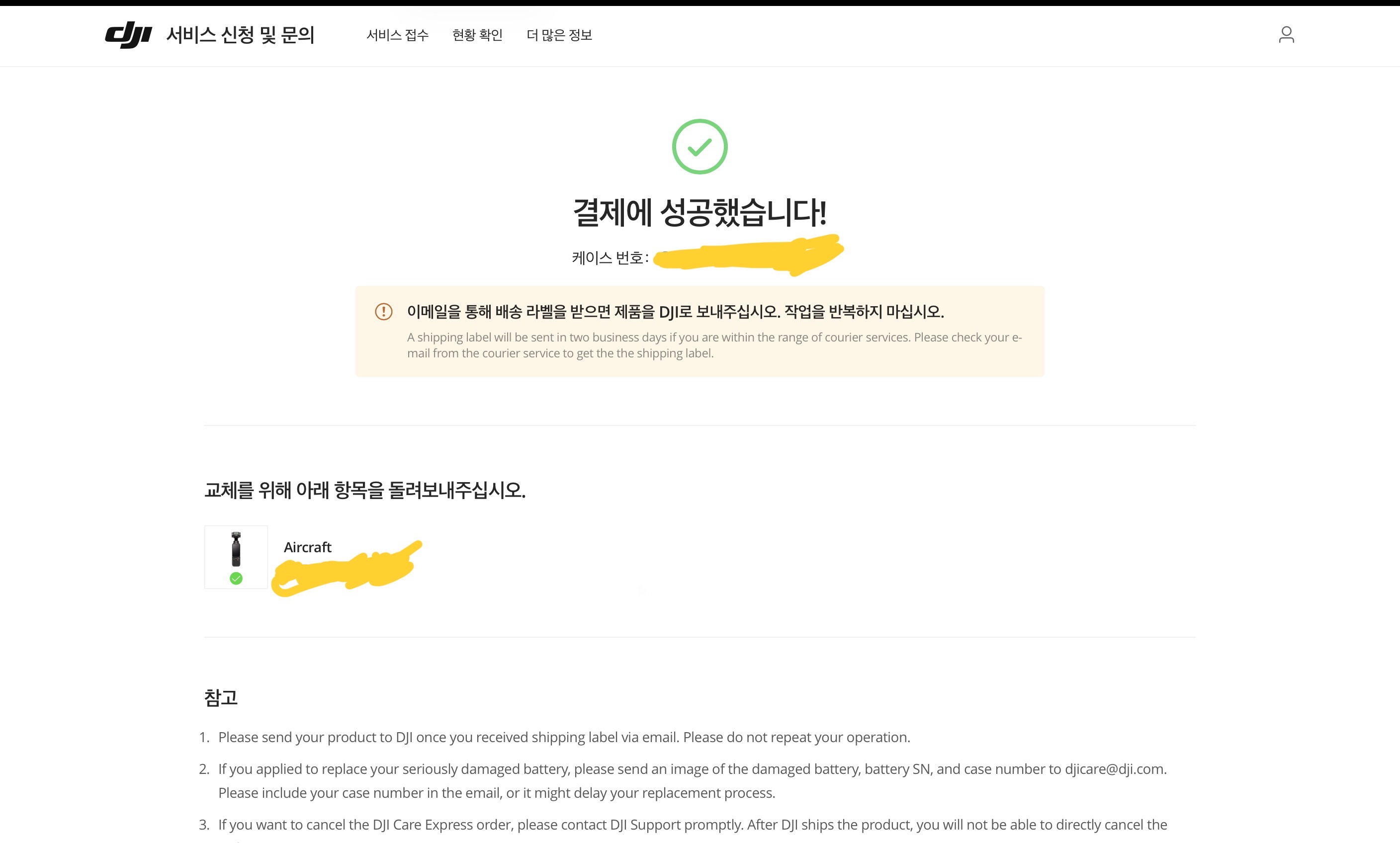 참고로 택배 수리 접수는 손상 정도에 따라 수리비가 청구되는 것이고, DJI 케어 리프레시의 경우 가입된 분에 한해 일정 비용을 내면 아무것도 묻지도 따지지도 않고 제품을 교환해주는 방식입니다. 애플의 애플케어플러스같은 개념이라고 보시면 됩니다.