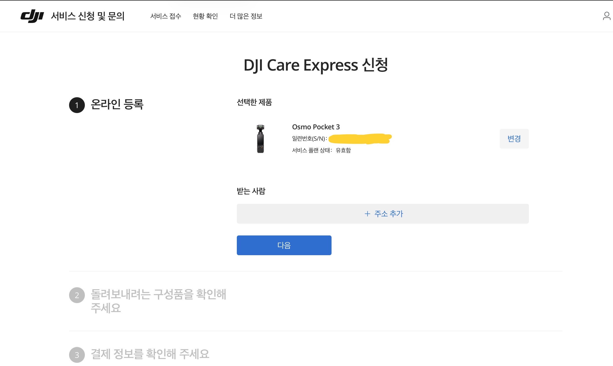 그리하여 DJI 케어 리프레시를 본격적으로 활용하여 교체하기로 마음먹고 본격적으로 신청을 하기 시작했습니다.