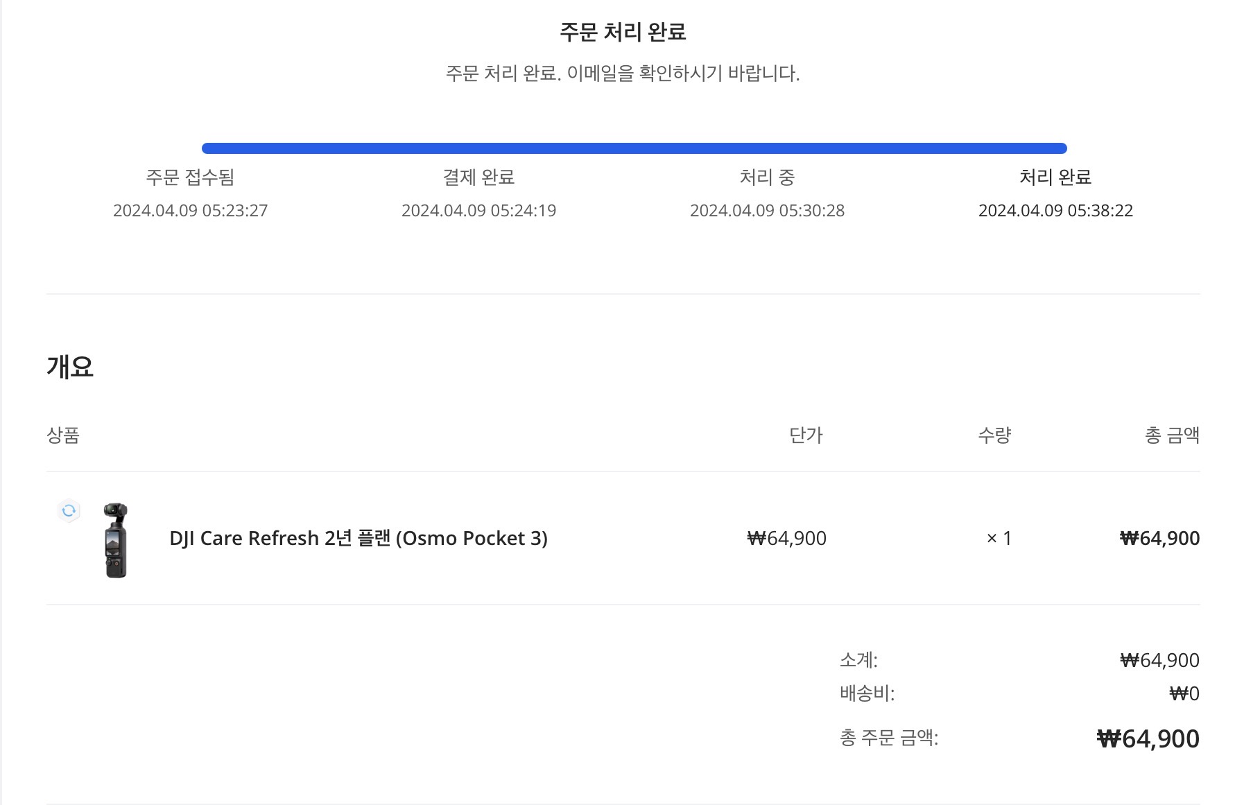 검색을 해보니 본체의 문제라는 내용들이 많아서 고민을 하던 중 제가 포켓3를 구매하면서 DJI 케어 리프레시 플랜에 가입했던 것이 떠올랐습니다. 2024년 4월 9일에 가입했으니 진짜 만료 직전에 교체를 하게 되었습니다.