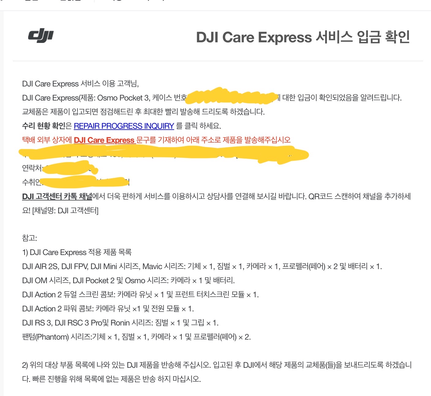 참고로 택배 수리 접수는 손상 정도에 따라 수리비가 청구되는 것이고, DJI 케어 리프레시의 경우 가입된 분에 한해 일정 비용을 내면 아무것도 묻지도 따지지도 않고 제품을 교환해주는 방식입니다. 애플의 애플케어플러스같은 개념이라고 보시면 됩니다.