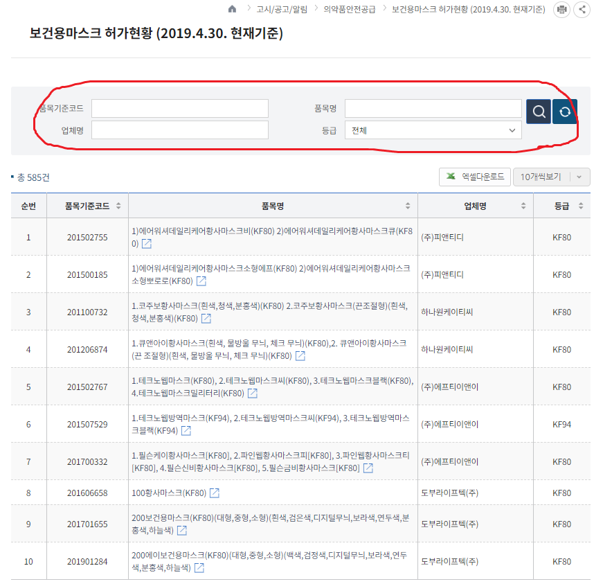 일단 사이트 내에선 2019년 4월 30일 기준으로 허가를 받은 제품들 목록이 작성되어 있습니다.