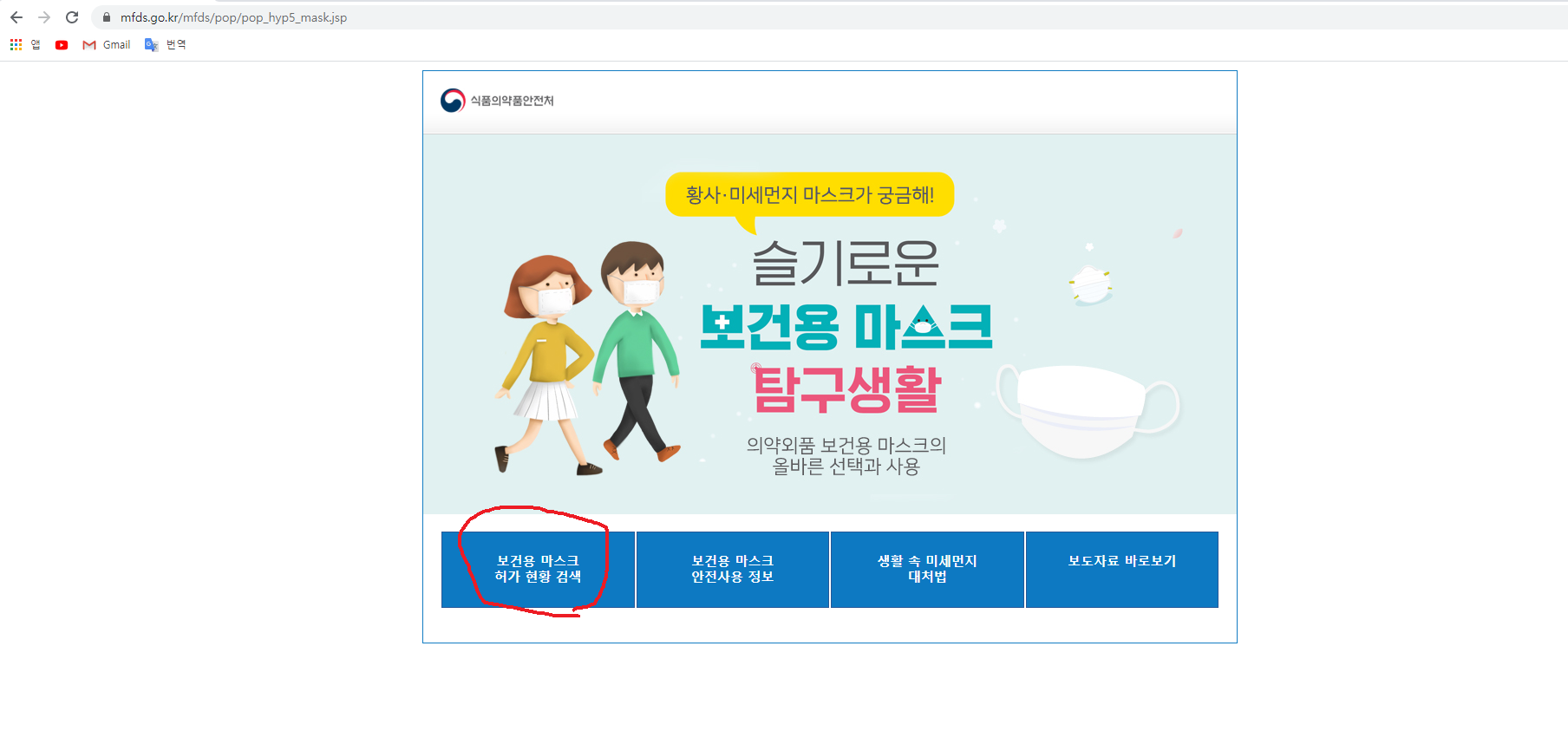 왼쪽에 있는 보건용 마스크 허가 현황 검색을 클릭을 하셔서