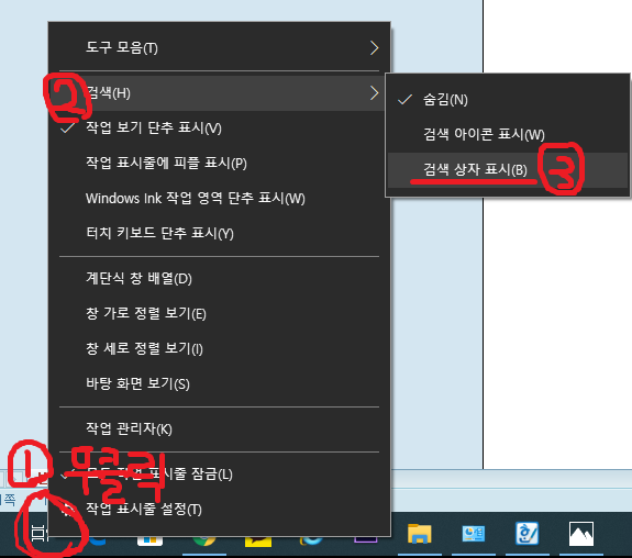 검색창을 다시 나타나게 하는 방법. 윈도우즈 모양과 마이크로 소프트 엣지 사이에 있는 작업 보기 버튼을 우클릭하고 - 검색 - 검색 상자 표시를 누르면 됩니다. 만약 다시 검색창을 나타나게 하고 싶다면
