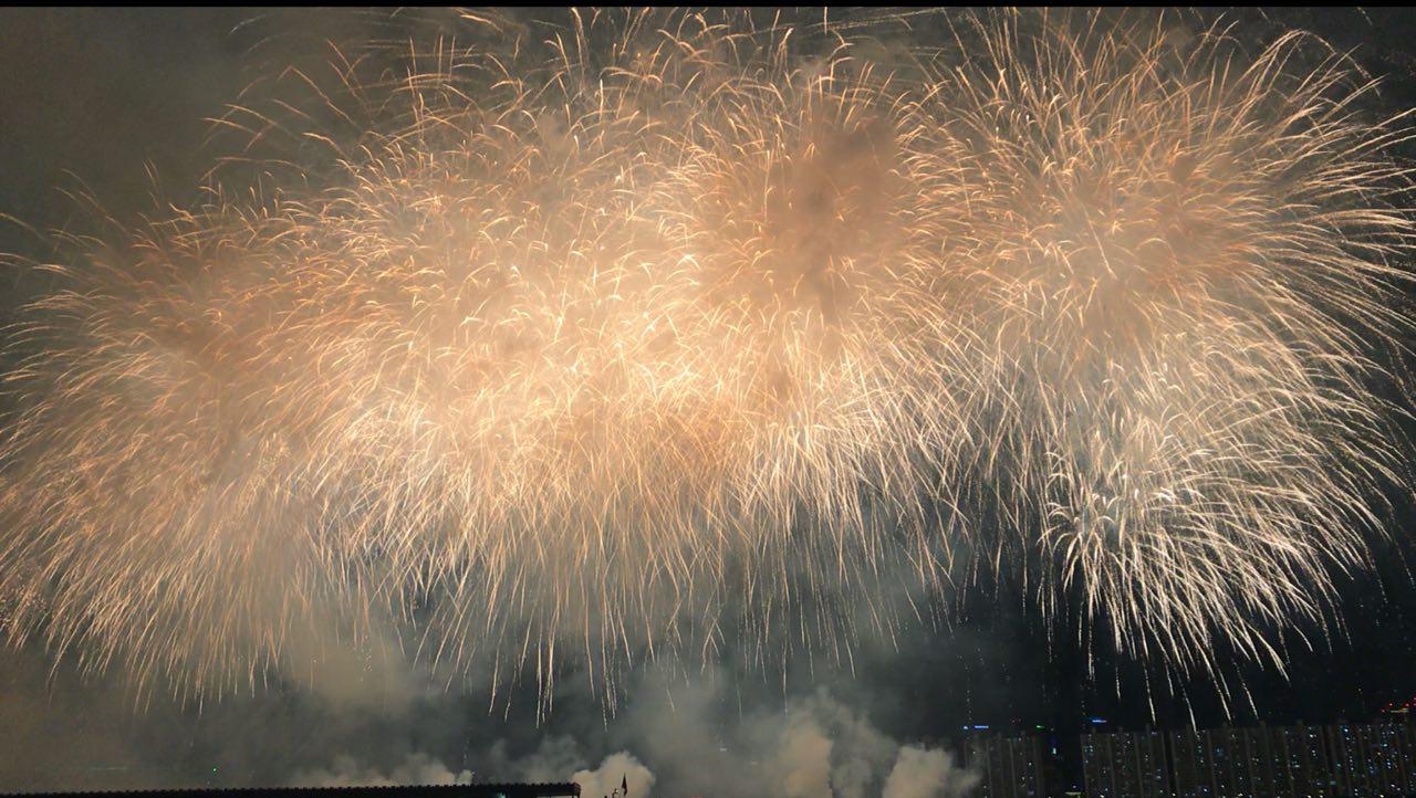 위에서 크게 터지는 것이 타상연화, 밑에서 낮게 터지는 것은 장치연화. 명당은 이 두 종류의 폭죽이 잘 보이는 곳이라고 생각하시면 됩니다. 소리도 상당히 중요한 요소입니다. 불꽃축제의 연출은 주제를 가지고 있는데
