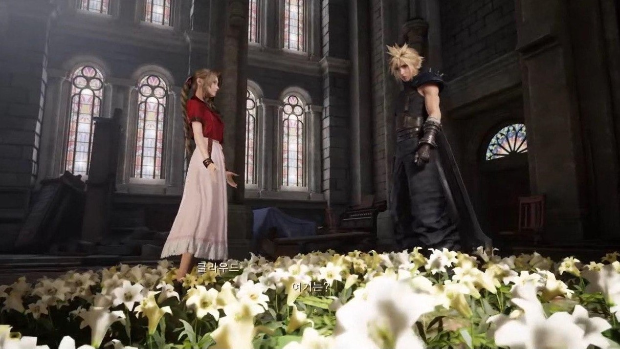 클라우드와 에어리스가 재회하는 장면. 꽃잎에 대한 표현이 좀 아쉽습니다. 이 외에도 클라우드의 초반 숙소에서의 세면도구 등등 눈에 잘 들어오는 사물들의 표현이 저품질인 부분이 많습니다. 정식 발매 이후로 아직까지 공식적인 패치가 없었고, 게임 전체적으로 이런 현상이 있는 걸 보면 이 부분은 개선될 여지가 없어 보입니다.