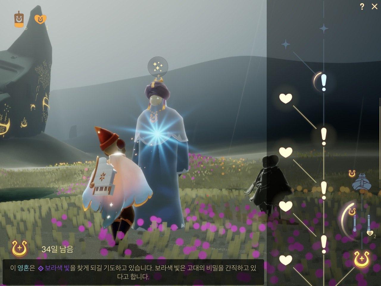 지식의 동굴에서 지난 번에 새로 추가된 구역, 시즌 양초가 나오는 구역에서 보라색 빛이 저렇게 자유롭게 움직이는지.. 보라색 빛은 바로 지식의 동굴에 있습니다.