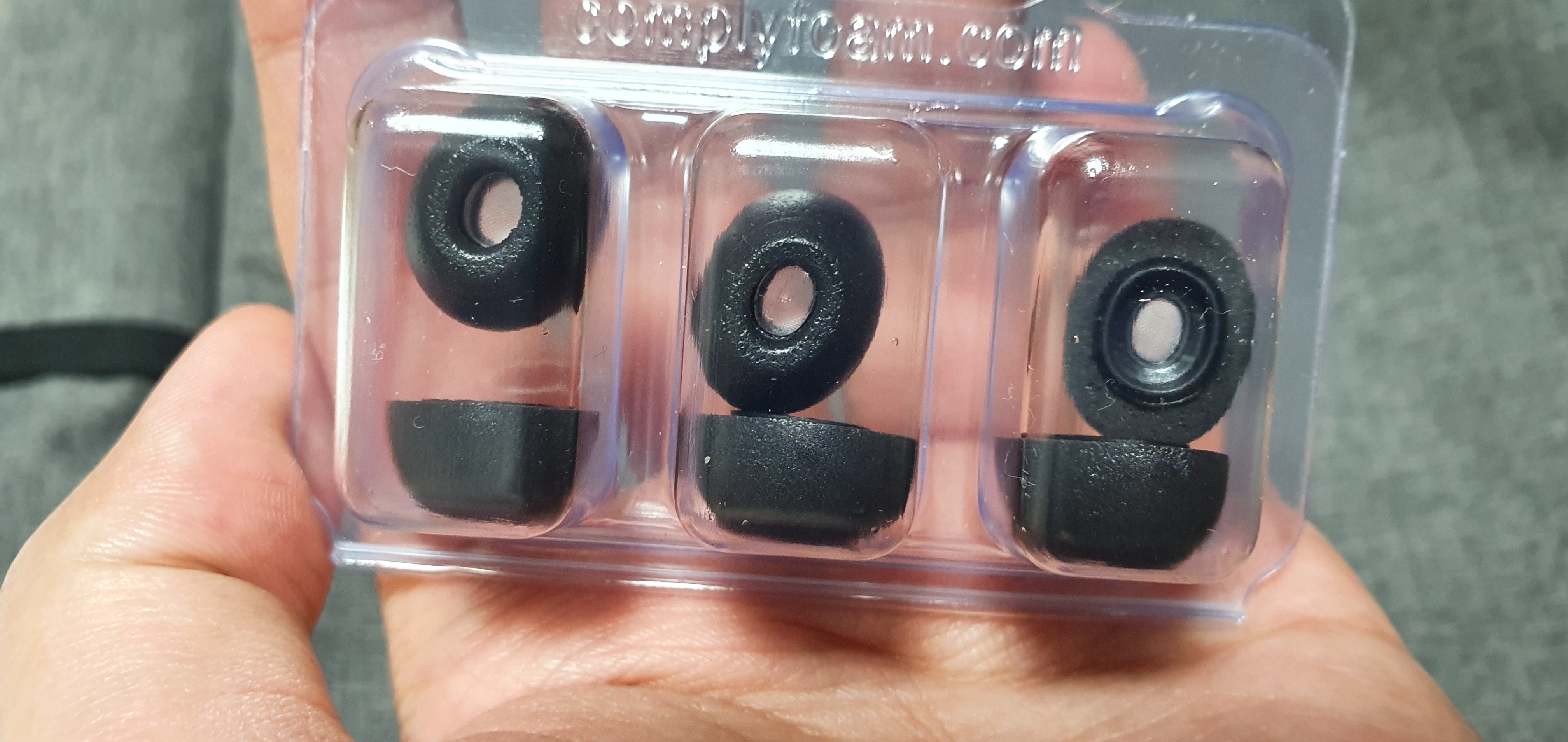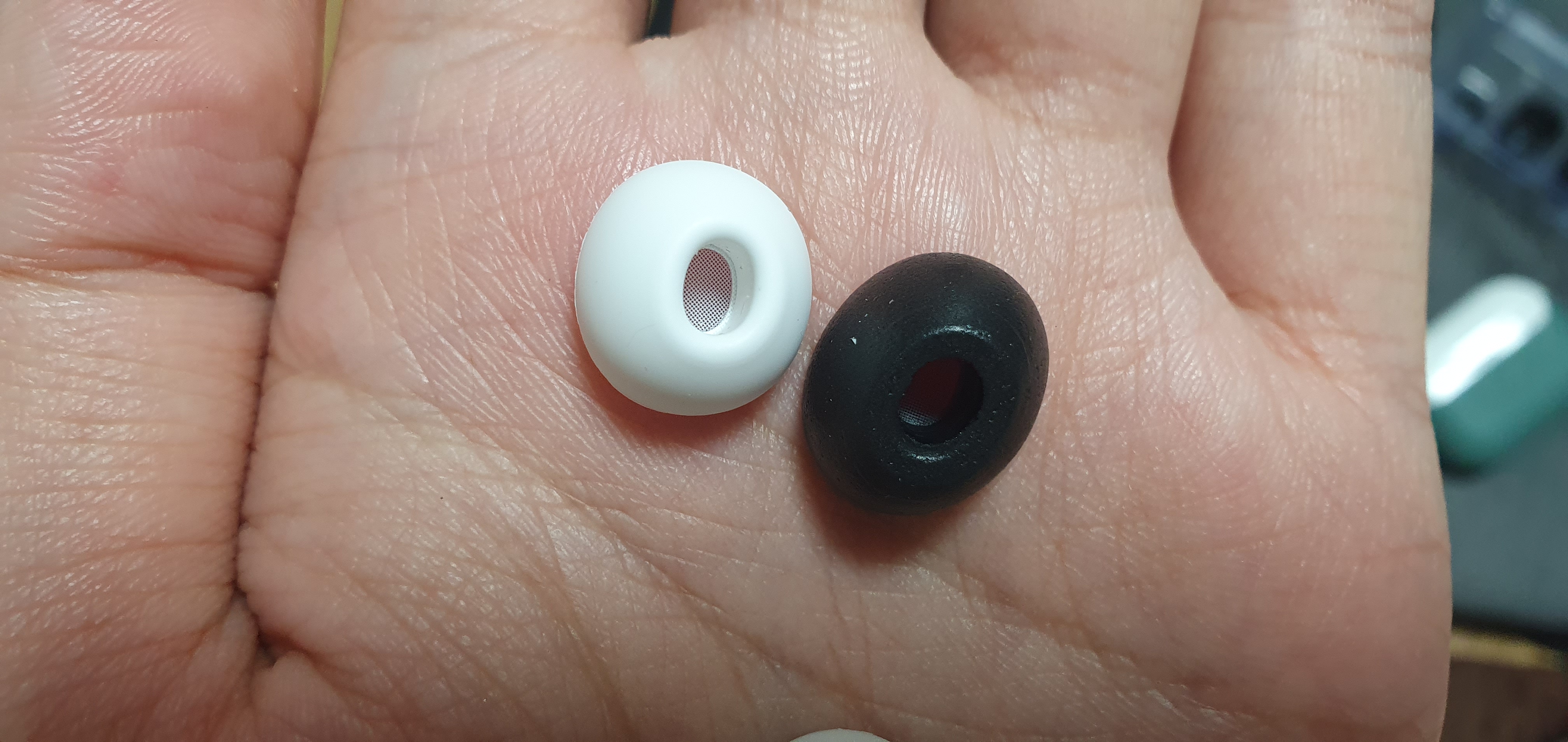기본 실리콘팁과 컴플라이 폼팁 비교. 확실히 전체적인 크기와 두께가 증가했습니다.