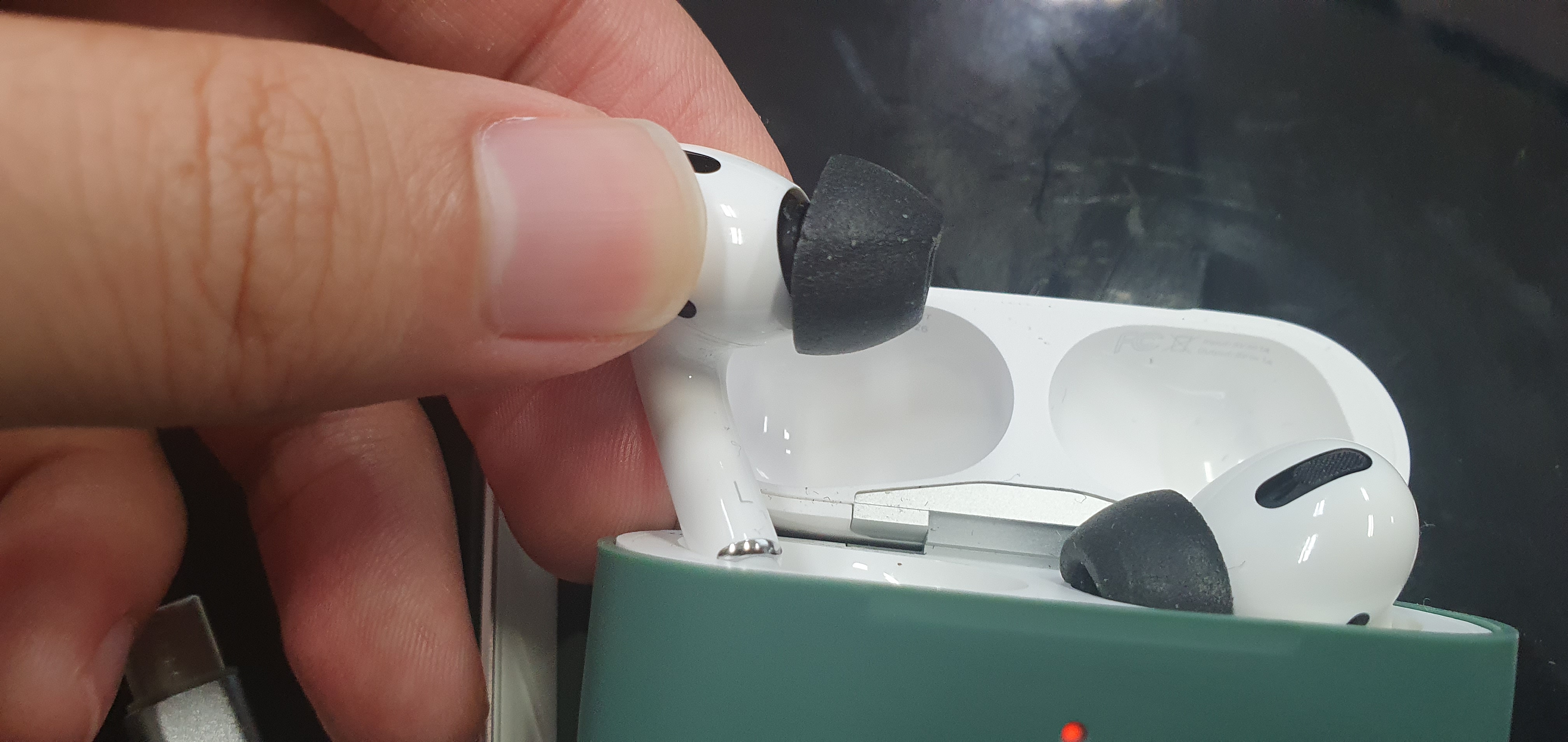 폼팁의 크기 커지다 보니 케이스 뚜껑이 닫히긴 하지만 기존처럼 꽉 닫히진 않습니다. 그리고 꺼내서 보면 약간 찝혀서 들어가는걸 확인할 수 있습니다. -소리 변화
