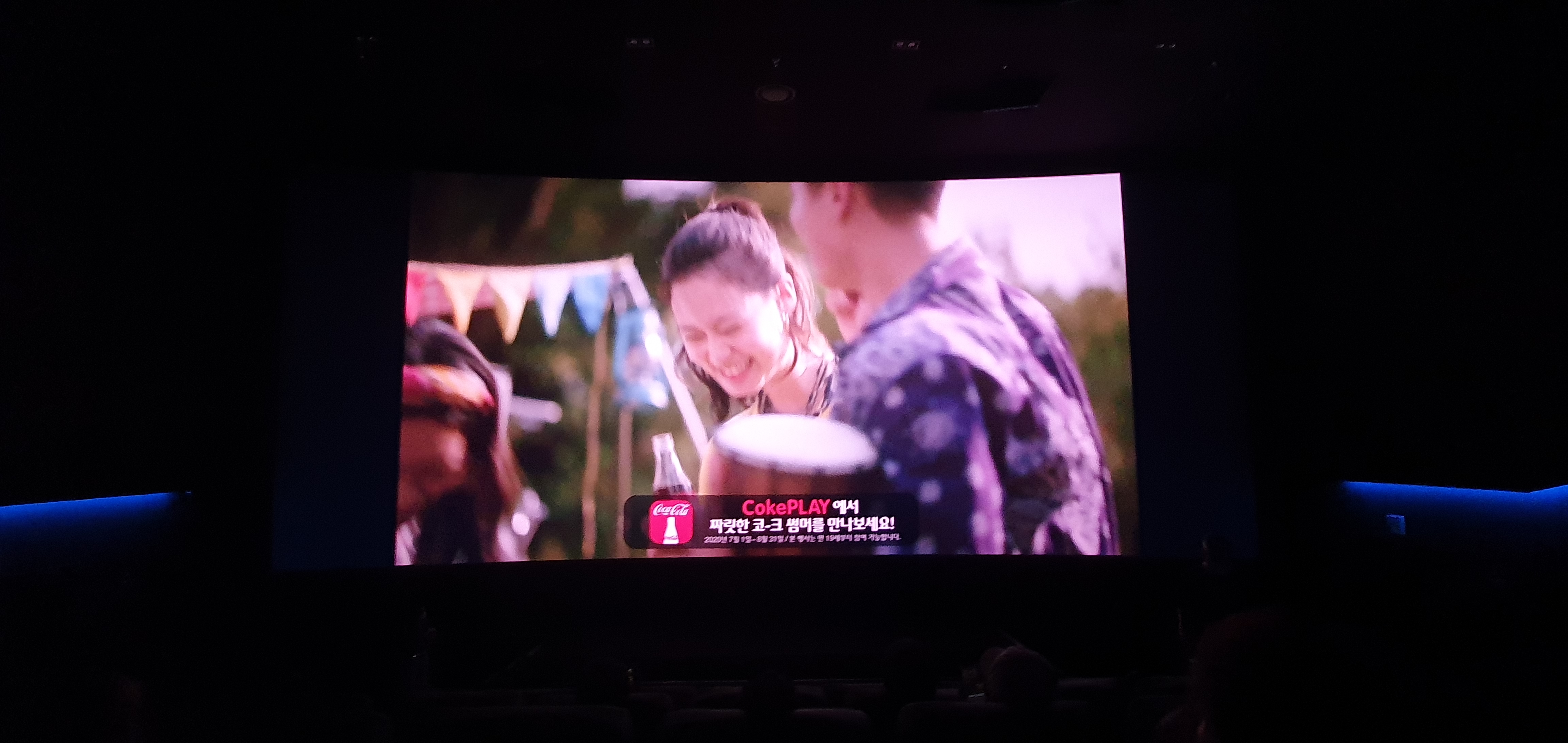 G12 좌석에 앉아서 갤럭시S10 초광각으로 촬영한 사진. 상당히 어두운 모습이고 광고는 플랫 비율이라 스크린 좌 우가 여백. 단차가 낮은 편이라 앉은키가 큰 사람이 앞에 앉으면 머리가 스크린 밑부분을 가릴 수 있습니다.