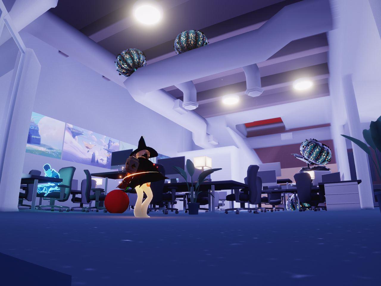 사무실의 전체적인 풍경이 전부 바뀌었습니다. 할로윈 컨셉에 맞게 하늘은 붉게, 사무실 내부엔 호박 모양의 어둠이,