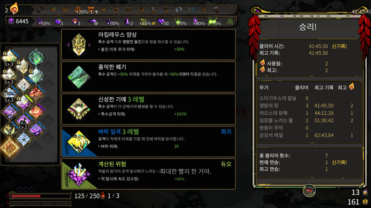게임은 의외로 짧은 편입니다. 하데스를 잡는 것이 클리어인데 시작부터 클리어까지 아무리 길어도 1시간 내외로 진행됩니다. 간단하게 한 판 해볼까 하고 플레이 할 수 있는 시간대입니다.