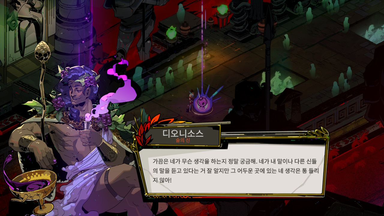 한 가지 예를 들자면 게임 내엔 여러 가지 재화가 있습니다. 금화의 경우는 한 번 죽으면 무효가 되지만 보석류들은 죽음과 상관없이 영구적으로 귀속이 되며 여러 능력치나 속성, 게임 내에서의 인테리어나 던전 일부를 휴식지로 바꿔주는 등 다음의 시도에 영향을 줄 수 있습니다. 그 외에 NPC들의 대사가 너는 누구에게 죽었구나, 혹은 여러 번의 시도를 거듭하며 근황을 묻는 등의 대사들이 계속 추가가 됩니다. 다양한 인물들의 새로운 대사가 죽음을 거듭하면서 추가되고 이벤트도 등장합니다. 경우에 따라 던전에서 얻은 물건을 주변 인물에게 선물로 줄 수 있는데 이것으로 인물간의 친밀도를 향상시켜 또 다른 이벤트가 발생하기도 합니다. 게임의 중심 이야기는 단순하지만 중심 가지에서 나온 가지들의 부가 이야기나 콘텐츠들이 상당히 많습니다. 게임을 계속 하다 보면 단순한 자그레우스의 탈출기에서 여러 인물들이 등장하는 드라마처럼 주변 인물들 간의 다양한 관계를 즐기는 재미를 느끼게 됩니다.