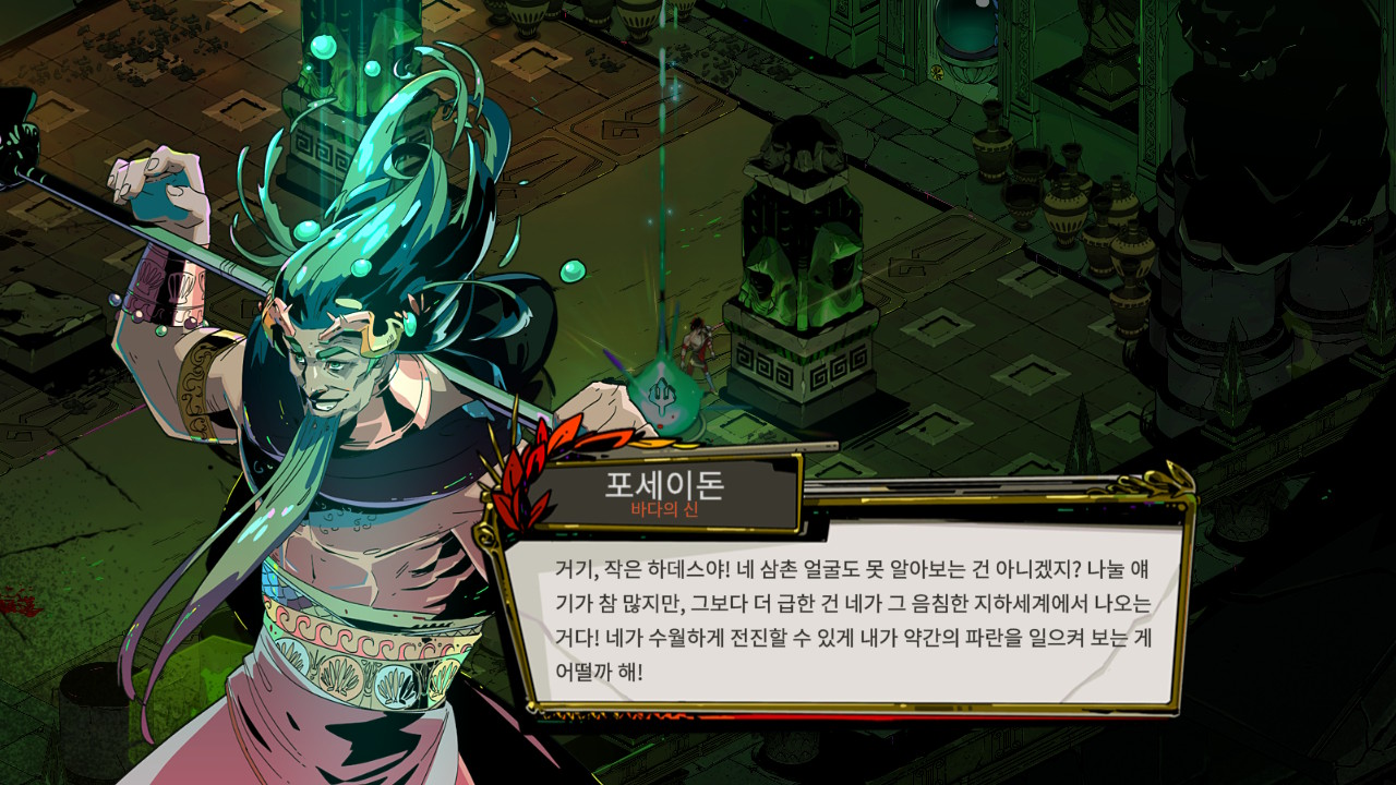 미국 만화적인 느낌의 화풍으로 그려진 각종 신들의 모습과 스테이지는 각자의 개성과 성격을 잘 담아냈고, 거대하지만 딱딱하지 않고 흥미롭게 그려져 마치 만화책 시리즈를 보는 느낌이었습니다. 또 게임에서 캐릭터들의 모든 대사가 비록 영문이지만 전체 더빙이 되어 있는 것도 굉장한 장점이었습니다. 단순히 플레이어가 무심하게 지문만 대충 읽고 넘어가는 내용도 더빙되어 있는 음성을 들으며 등장인물간의 고성 또는 대화에 집중하게 됩니다. 이 역시 하데스의 세계관에 더 몰입하는 요소로 작용합니다.