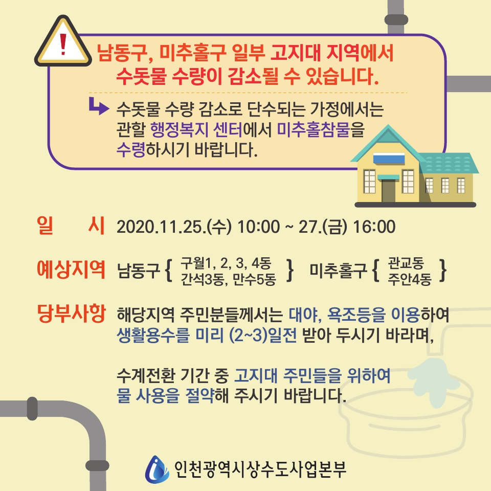 2020년 11월 23일부터 27일까지 인천 수산정수장 수계전환으로 인한 남동구 미추홀구 일부 단수 예정정보 2020. 11. 23. 14:57반응형
