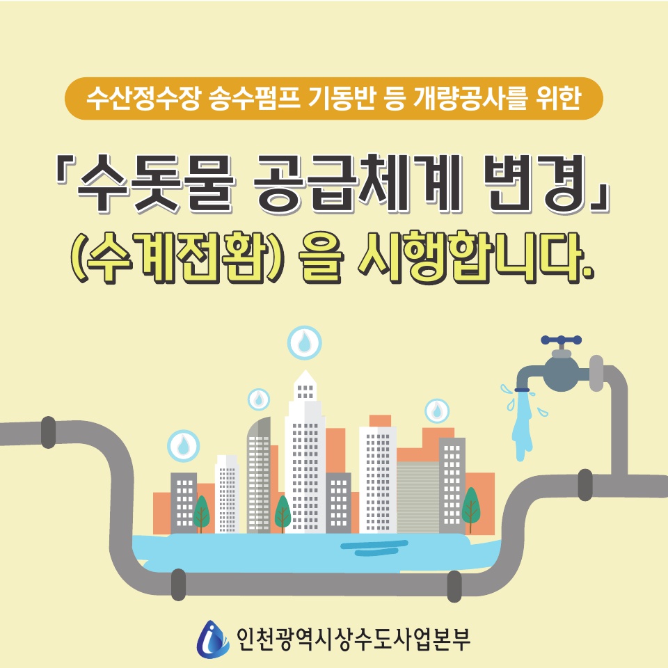 >Home>열린광장>상수도소식 > 수산정수장 가동중지에 따른 수계전환 안내 | 상수도사업본부