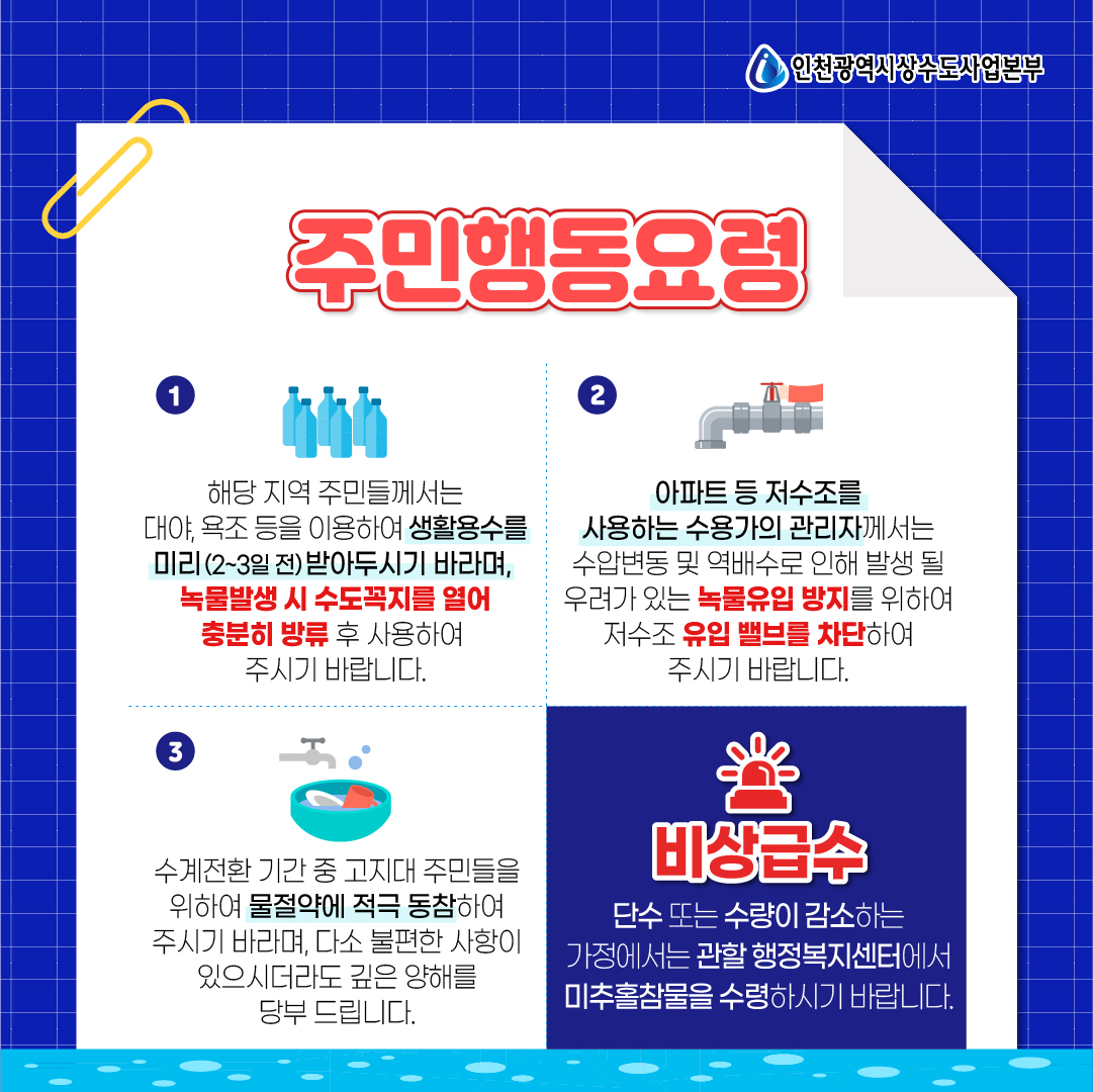 해당 지역 주민 행동 요령으로 2~3일 전부터 생활용수를 미리 확보하고,