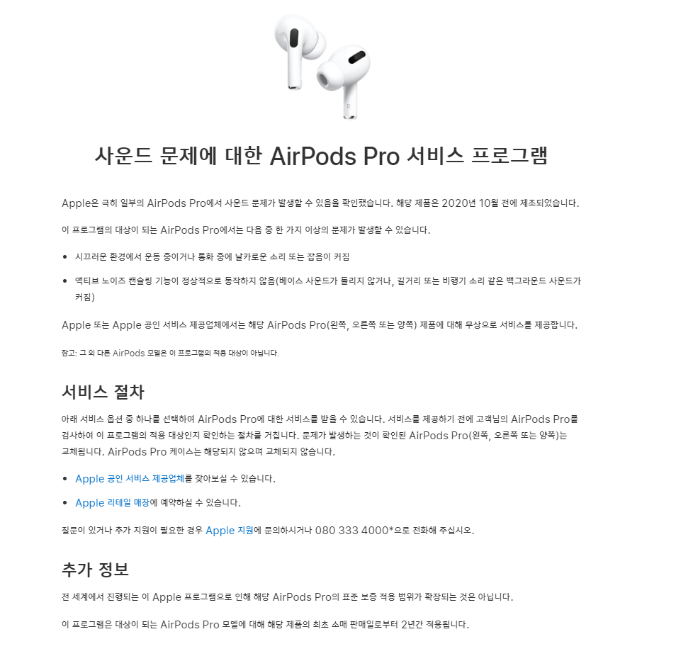 애플에서 지난 2020년 10월 말에 에어팟 프로에 대해 리콜을 실시한다고