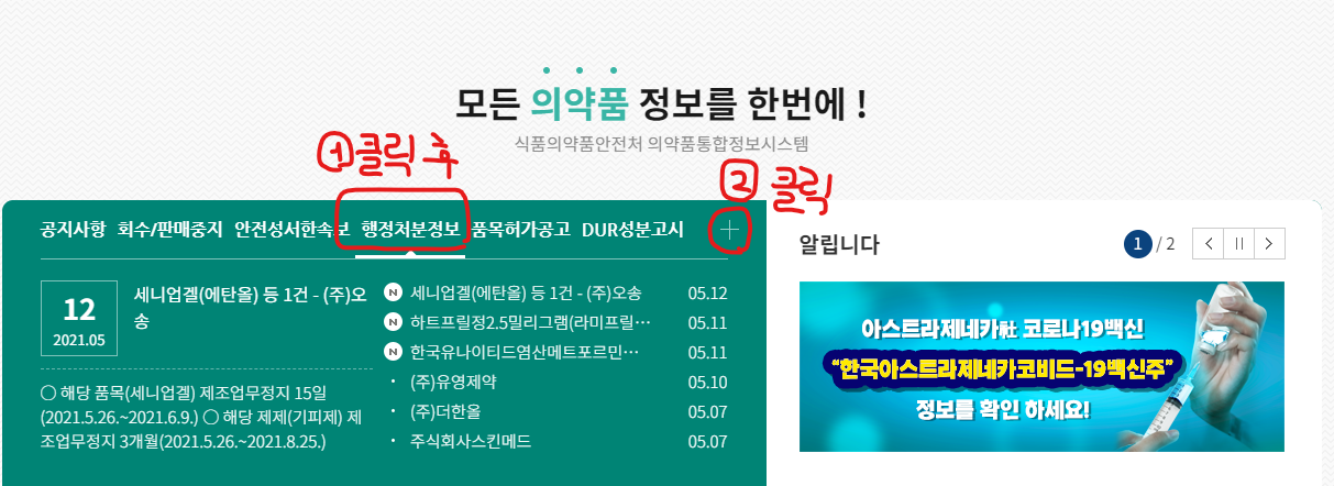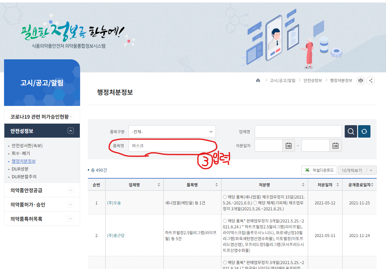 어떤 의약품이 문제가 있고, 어떤 행정 처분을 내렸는지 확인 할 수 있습니다.