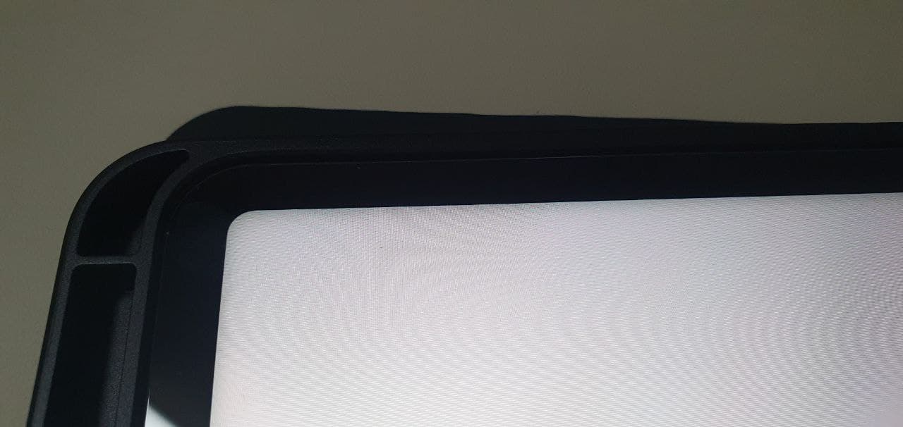 개인적으로 블루밍보단 테두리가 살짝 어둡게 보이는 현상이 좀 더 크게 느껴졌습니다. 다만 블루밍보다는 밝은 화면일 때, 베젤 즉 테두리 부분이 약간 어둡게 비네팅이 되어 그림자가 진 것 처럼 보이는 게 더 거슬릴 것 같습니다. 정면에서 화면을 바라보면 크게 못느끼지만 약간 옆에서 비스듬한 각도로 바라보면 살짝 보입니다.