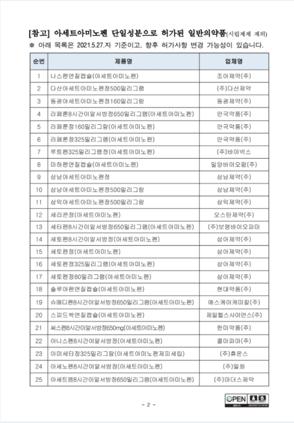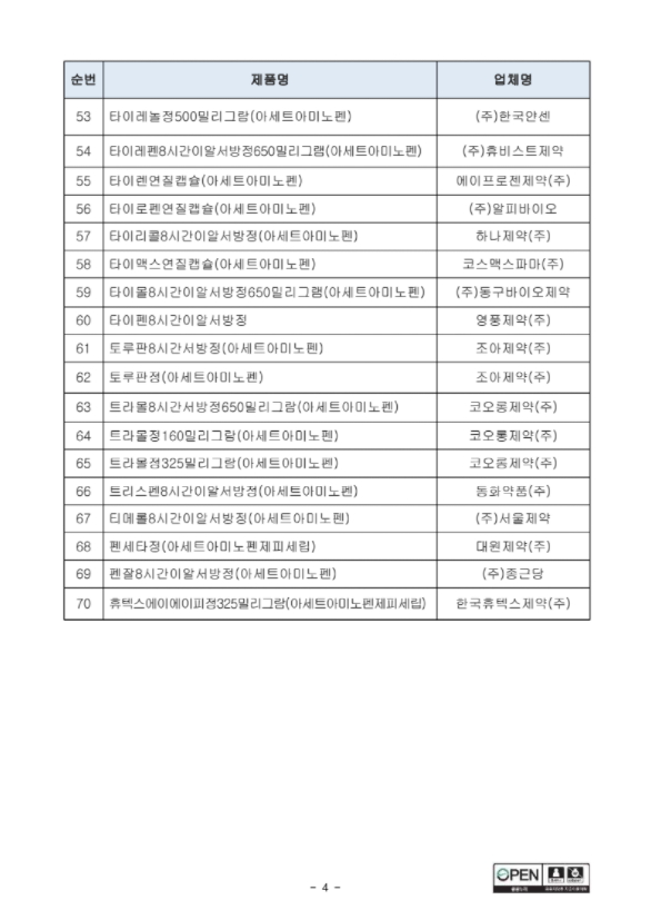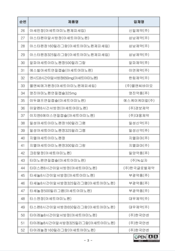 출처 : 식품의약품안전처 공지사항 일단 대표적으로 아세트아미노펜이라 적혀있는 제품들이 해당이 되는걸 알 수 있습니다.