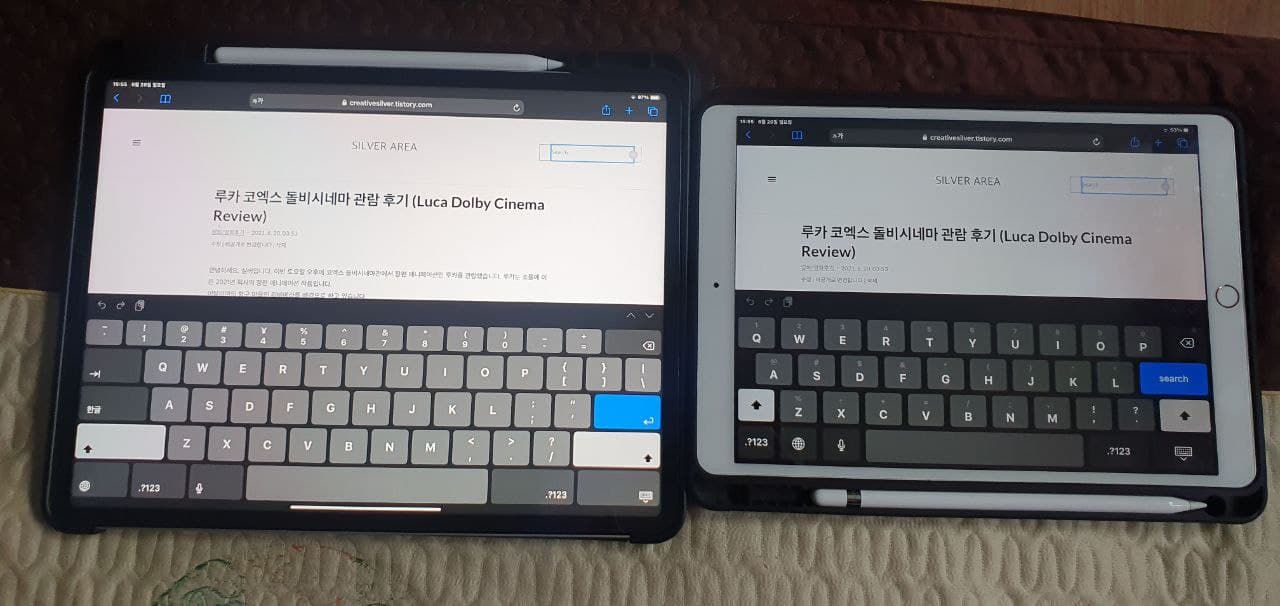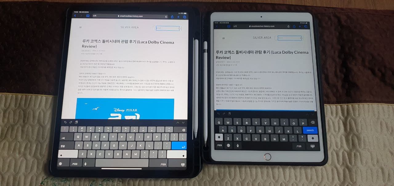 세로 모드로 사용했을때의 제 블로그 모습입니다. 비교 화면을 보시면 알겠지만 가로모드 사용 시 위 아래의 정보량이 10.5에서의 화면보다 더 많이 담겨져 있음을 알 수 있습니다. 좌우 여백의 경우 일부 앱에선 여백을 다른 화면(예를 들어 검색어 입력 부분을 여백에 추가)을 집어넣음으로서 동시에 더 많은 정보를 확인하도록 설계가 되었습니다. 그리고 무게가 상당히 많이 나가다 보니 두 손으로 잡고 사용할 때도 가로모드로 넣고 하는 것이 더 안정적이었습니다.
