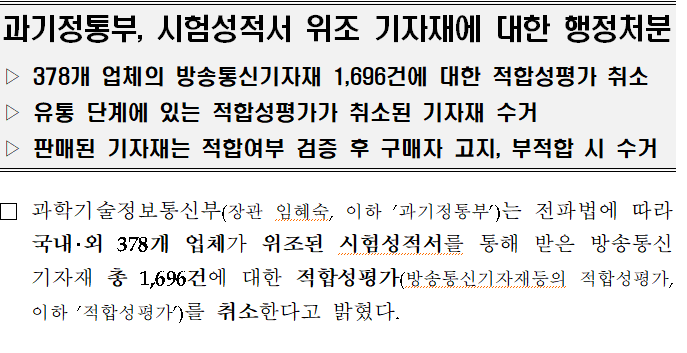 378개 업체, 1696개의 기자재에 대해 적합성평가 취소처분을 부과했습니다.