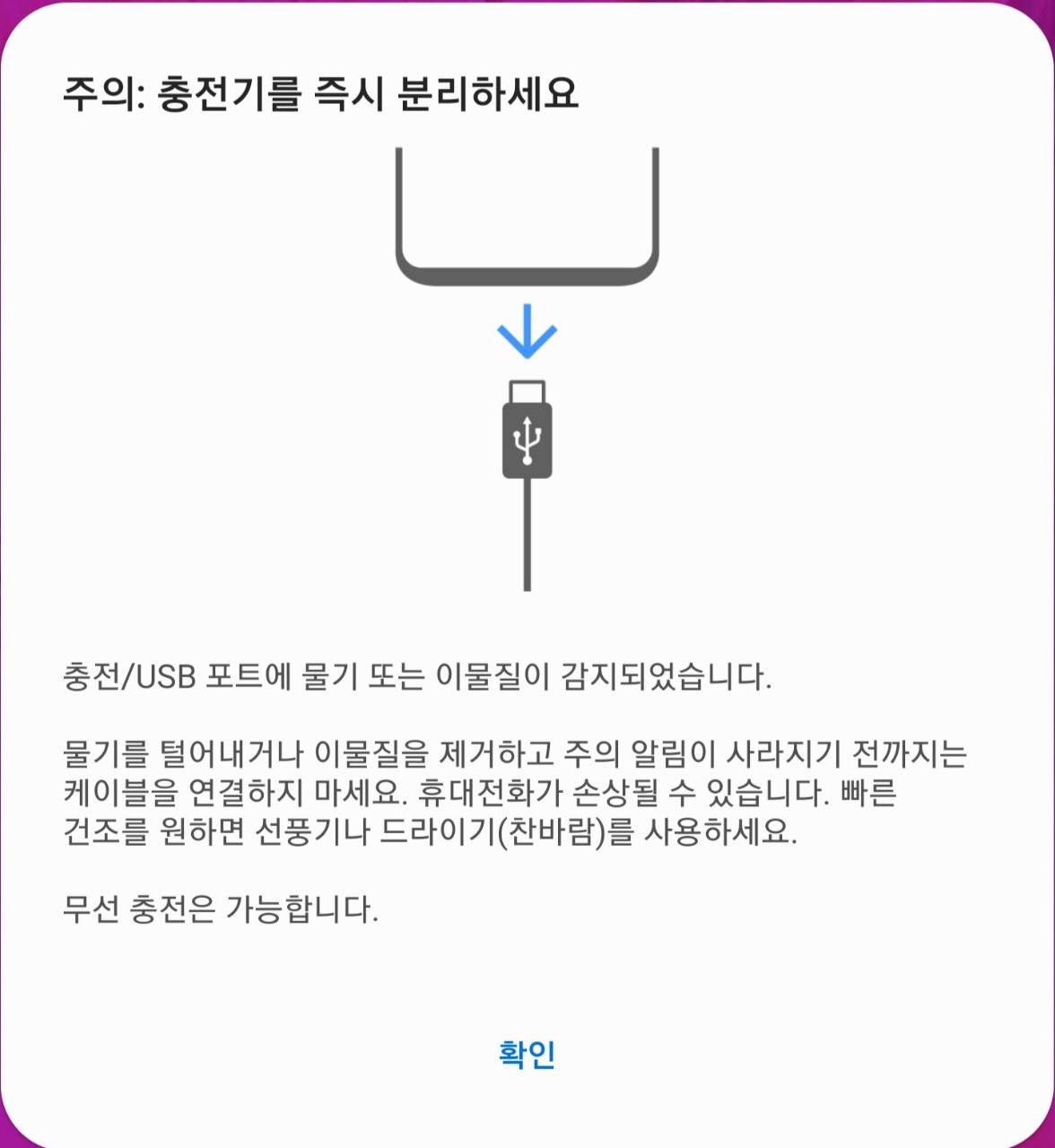 물기가 감지되었다는 알림과 함께 유선충전을 할 수 없는 상태가 되었습니다.