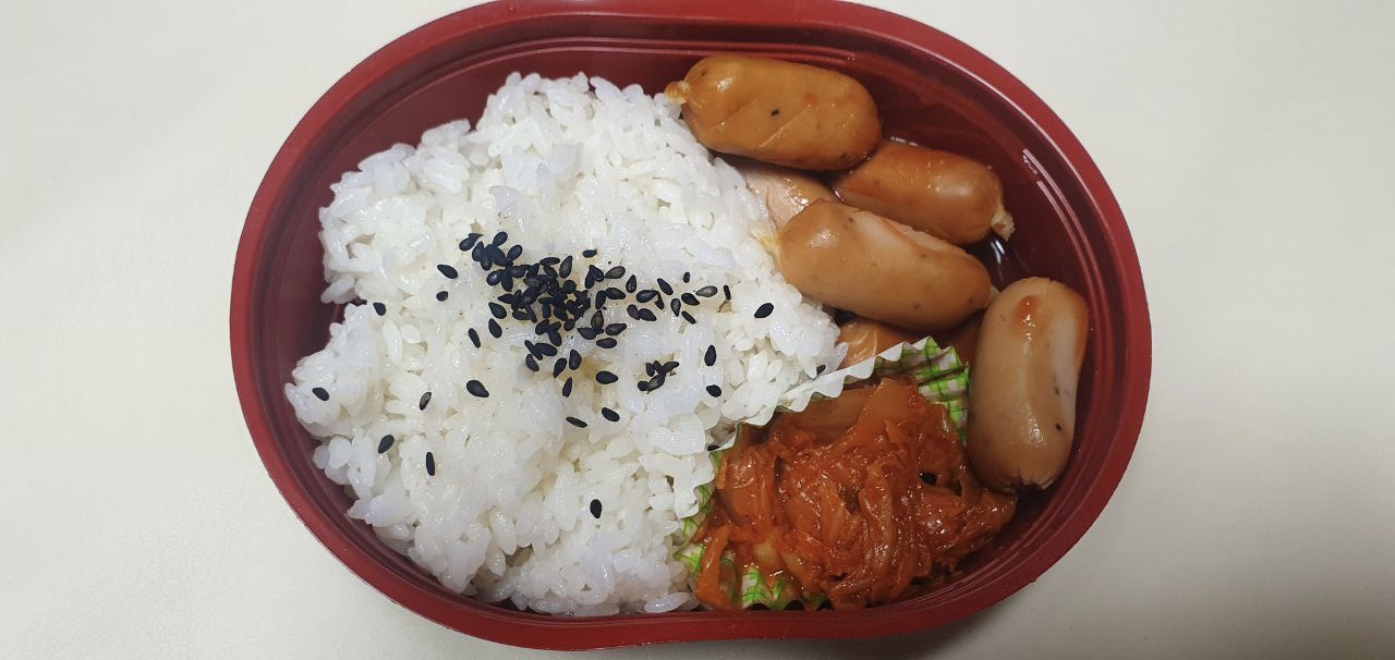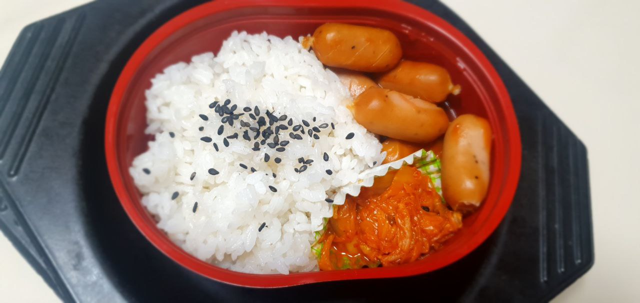대체로 밥, 소시지, 볶음김치는 생긴것과 같은 맛입니다. 무언가 독특하거나 특이한 맛은 없고 그냥 눈으로 보이는 정도의 맛입니다. 밥은 위에 얹어진 깨 등으로 살짝 간이 된 거 외엔 흰 쌀밥 맛이고, 소시지는 정말 소시지 맛이고, 볶음김치는 그냥 볶음김치 맛 그대로입니다. 2200원의 가격이기때문에 맛은 그냥 그런 수준이라고 생각하시면 됩니다.