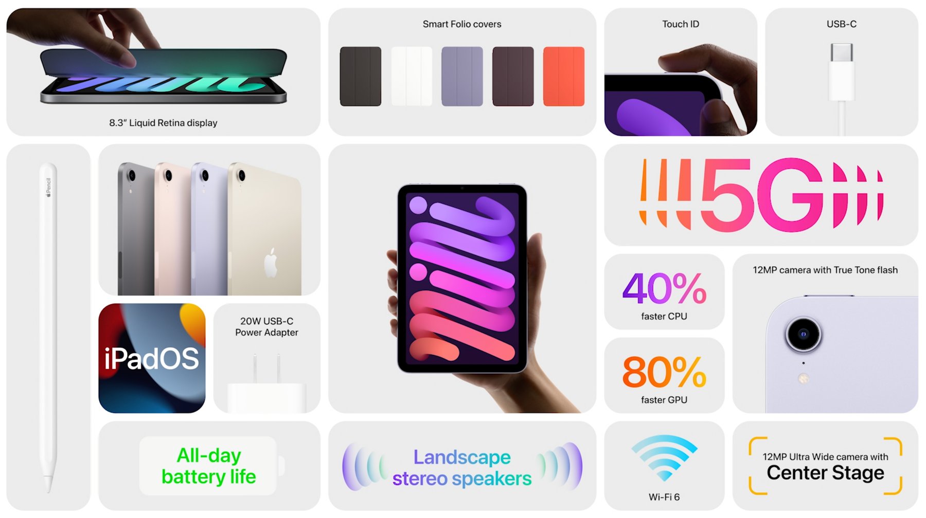 4가지 색상, 리퀴드 레티나 디스플레이, 8.3인치, 500니트 밝기
