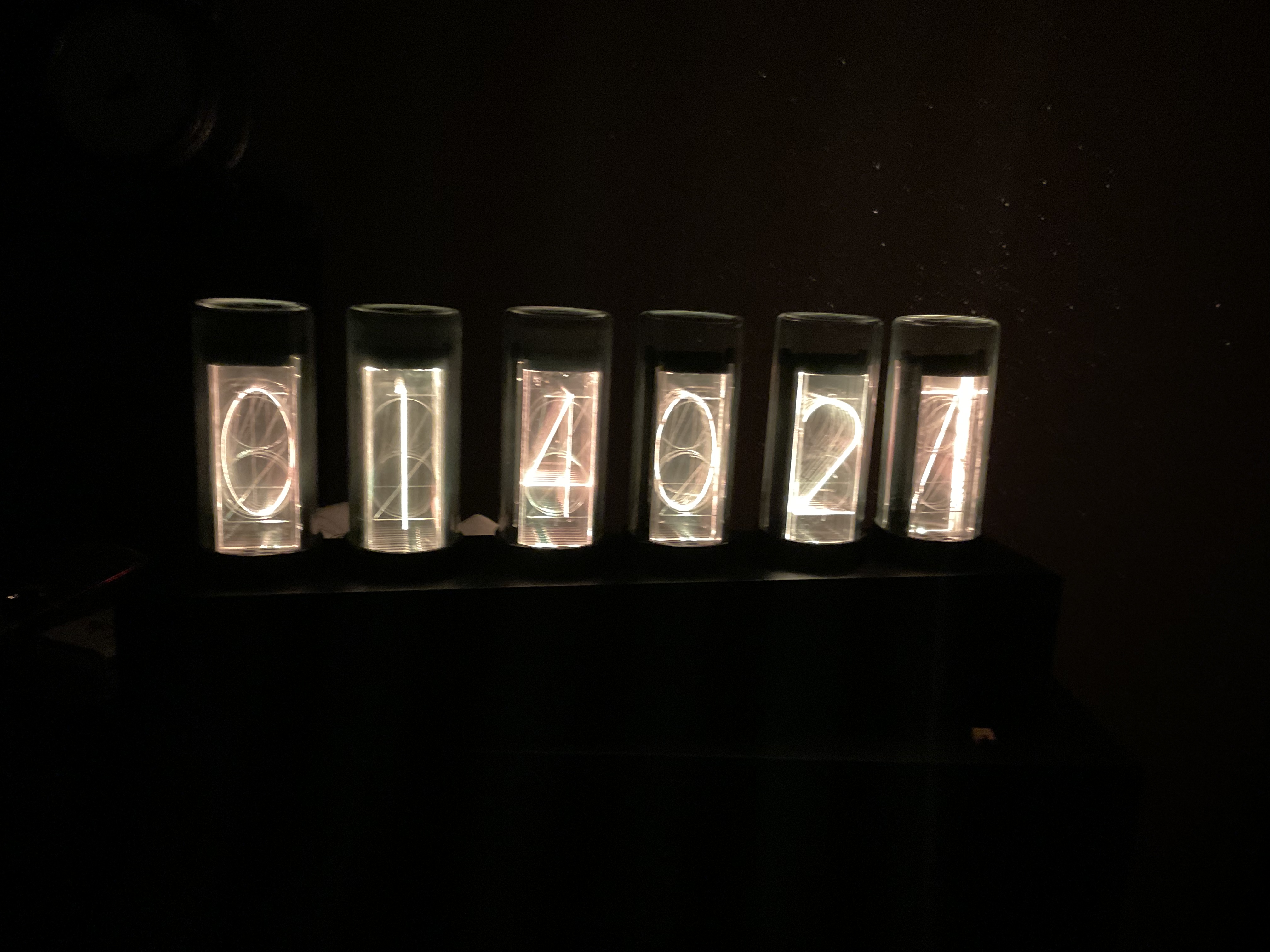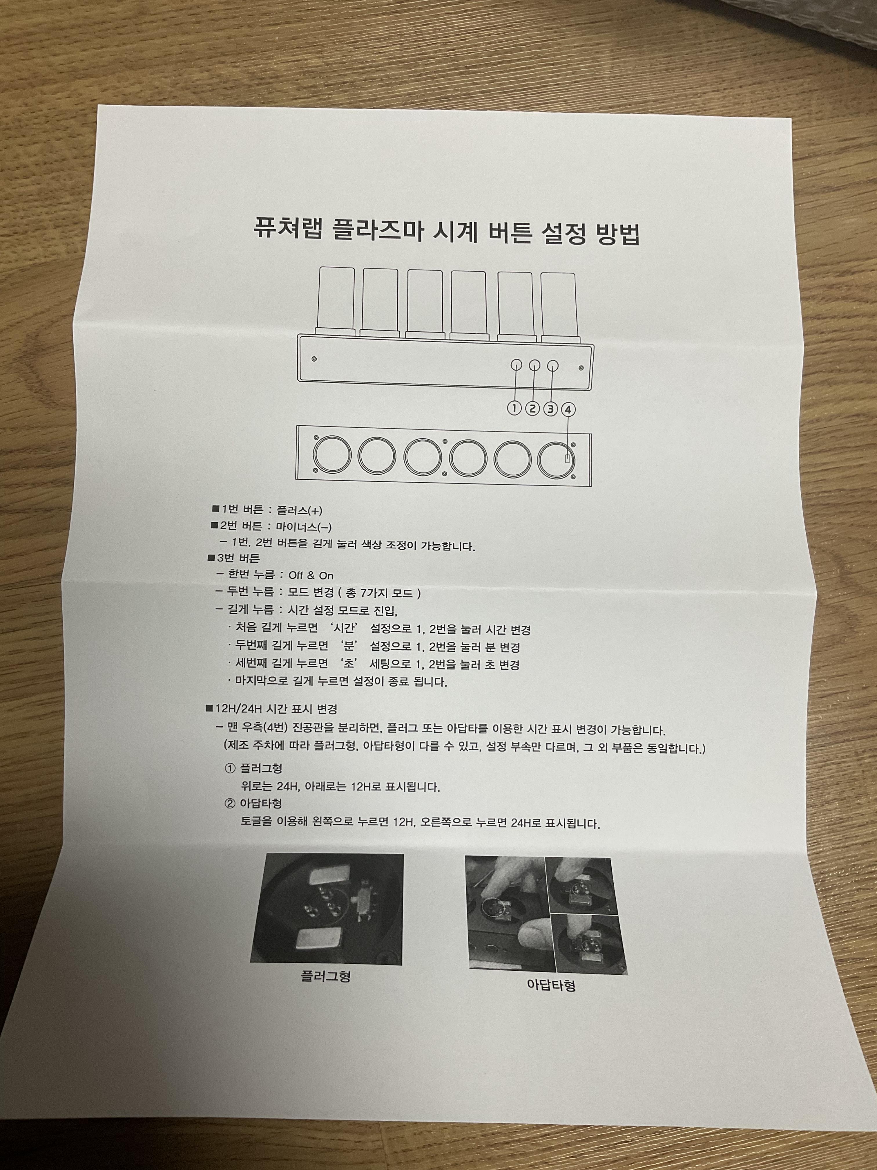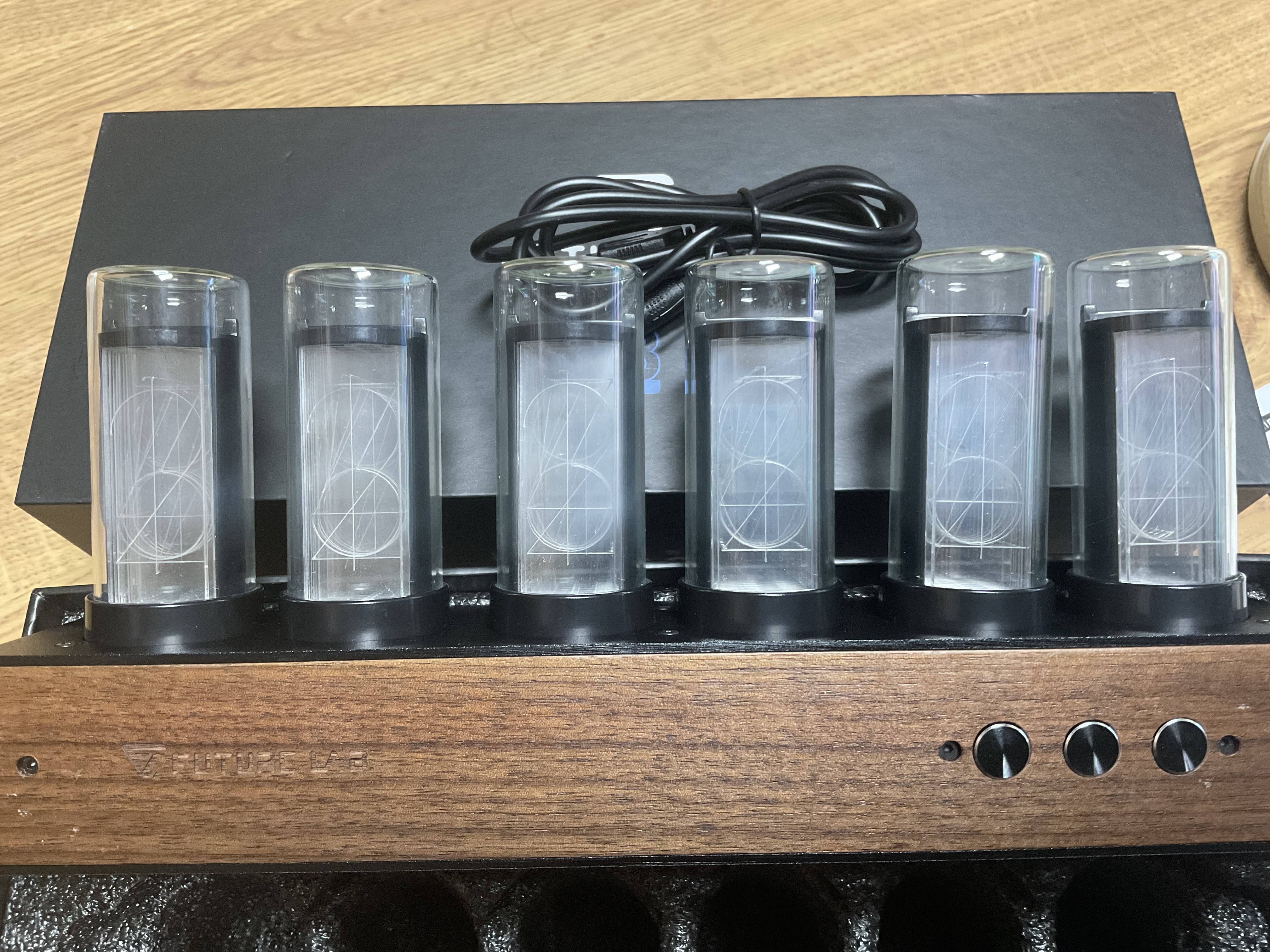 6개의 진공관을 전부 시계 본체에 부착한 뒤에 전원을 공급해주면 불이 들어오며 시간을 표시하기 시작합니다. 정확한 시간은 셋째 버튼을 설명서대로 길게 누른 뒤 시,분,초대로 시간 설정을 하시면 됩니다.