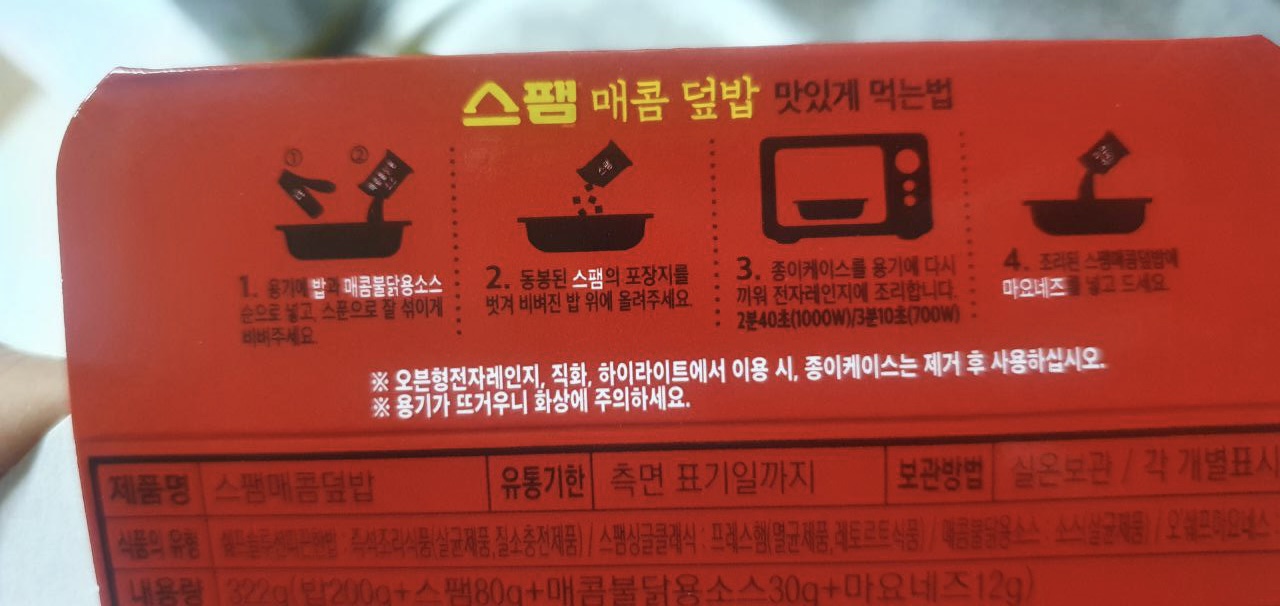 사실 아침에 먹던 김치찌개가 떨어지는 바람에 급하게 대신 먹을 수 있는 음식을 편의점에서 구매하는데 스팸이 딱 눈에 들어와서 이것으로 선택했습니다. 보기만 해도 스팸의 양과 붉은 색의 밥만으로도 맛이 없기는 힘든 식욕을 돋구는 음식 사진이었습니다.