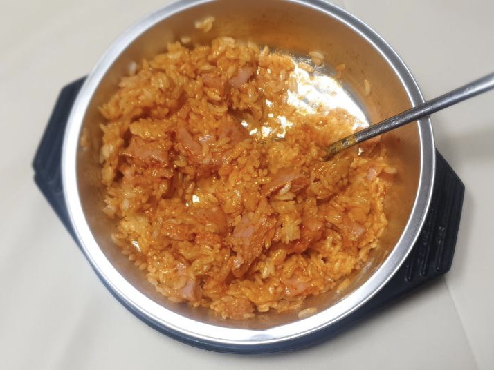 그 위에 매콤불닭용소스를 뿌려 비벼준 뒤 그 위에 동봉된 스팸을 올리고 잘게잘게 조각을 낸 뒤
