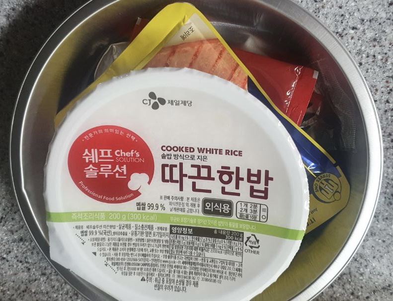 햇반은 아니지만 cj에서 만들어진 밥, 스팸 한 팩, 고추장같은 매콤불닭용 비빔소스와 마요네즈, 그리고 플라스틱 포카락이 동봉되었습니다.