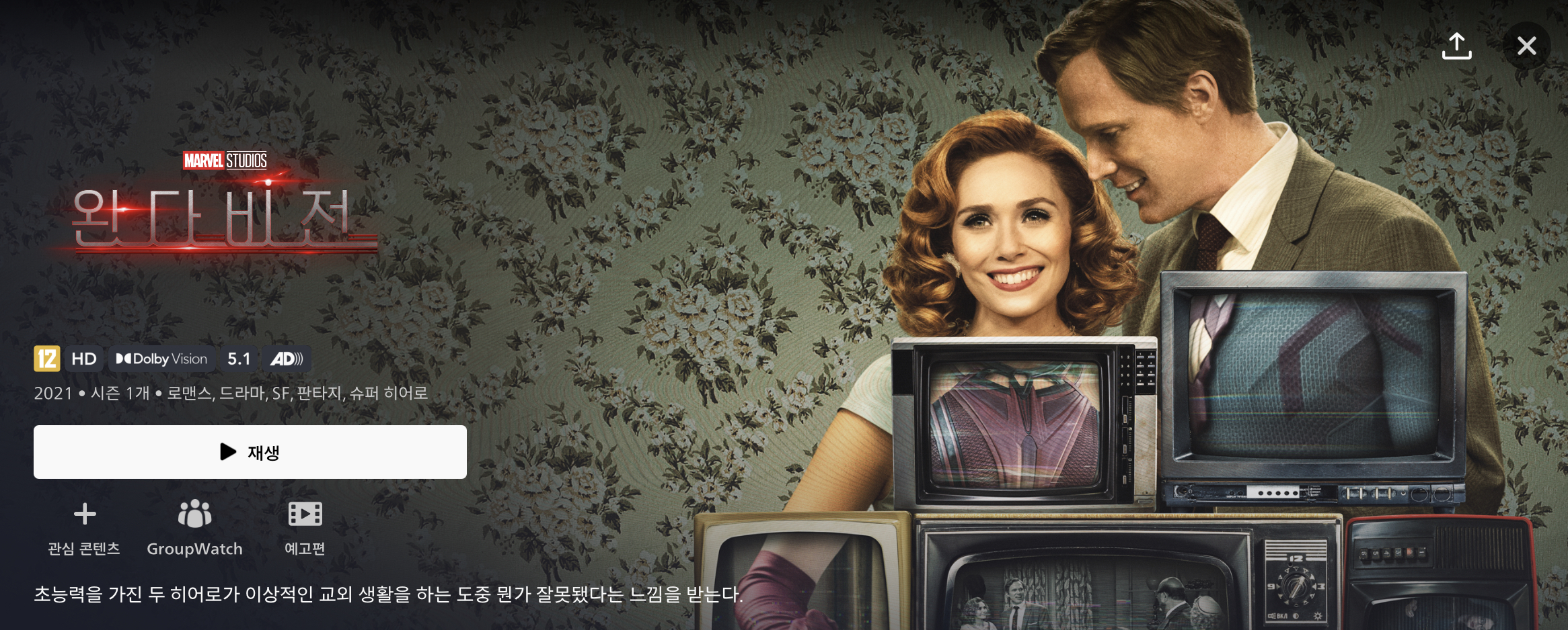 마블 드라마 중에서 가장 기대감을 갖고 본 작품이었습니다. 해외에서 공개되었을 때 부터 많은 호평을 받았다는 이야기로 기대감을 많이 가졌습니다. 개인적으로 2021년 공개된 MCU드라마 중에서 가장 훌륭한 작품이었습니다. 시트콤이라는 소재와 시청자와 출연자의 일정한 관계라는 전개방식, 그리고 파격이라는 단어가 어울릴 정도로 형식을 깨뜨리는 전개와 완다와 비전의 각각의 능력과 그들의 사연을 제대로 잘 풀어냈습니다. 초반 시트콤이 펼쳐지는 3화까지가 의외로 많은 분들이 시청하시기 힘들어하고 하차하시는 일이 많은데 3화까지 쭉 참으시면 그 이후부턴 정말 놀라운 장면들로 가득합니다.
