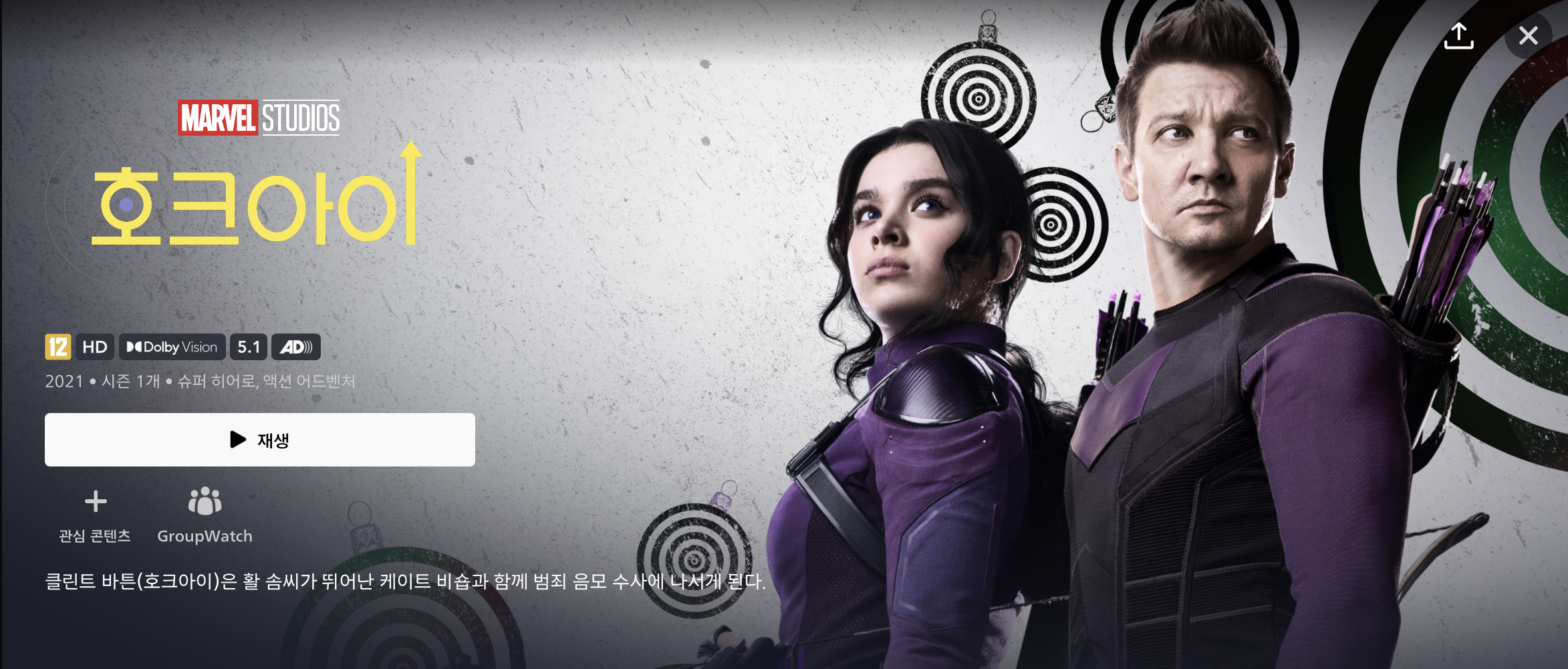 12월부터 공개된 호크아이는 매주 새로운 에피소드가 공개될 때마다 관람을 했습니다.