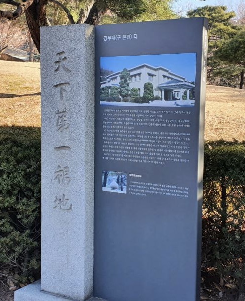 청와대의 옛 이름이었던 경무대의 본관 터는 경복궁 후원의 융문당 서쪽에 위치하던 수궁의 이름을 따 수궁터라고 합니다. 현재는 천하제일복지라는 글자가 새긴 표지석이 있는데 가장 으뜸이 되는 명당이라는 의미라고 합니다. 그리고 이 곳에 있는 구멍이 뚫린 나무는 청와대 내에 있는 나무중 가장 오래된 나무인데 700년이 넘는 세월동안 그 자리를 지키고 있다고 합니다. 90년대 초까지 구 본관이 있었던 자리였지만 김영삼 대통령시절 과거 청산의 일환으로 완전히 철거되었다고 합니다.